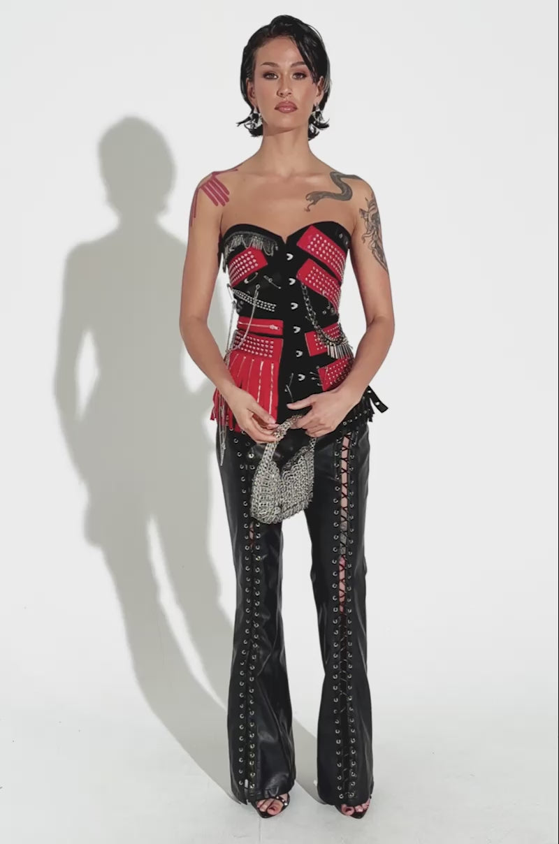 Live out your rock star fantasies in The AKIRA Label Demi Chain Corset. This unique top is crafted from a black denim base fabrication and features a sweetheart neckline, a button-down front closure with silver hook and eye fastenings, smooth interior lining, and an adjustable, lace-up back closure to ensure your perfectly cinched fit. An assortment of red and black silver-studded faux leather patches adorned the bodice, as do decorative zippers, safety pins, spikes, and chains. Style with skin-tight leather pants and platform boots for a bad*ss look that’s worthy of the stage.