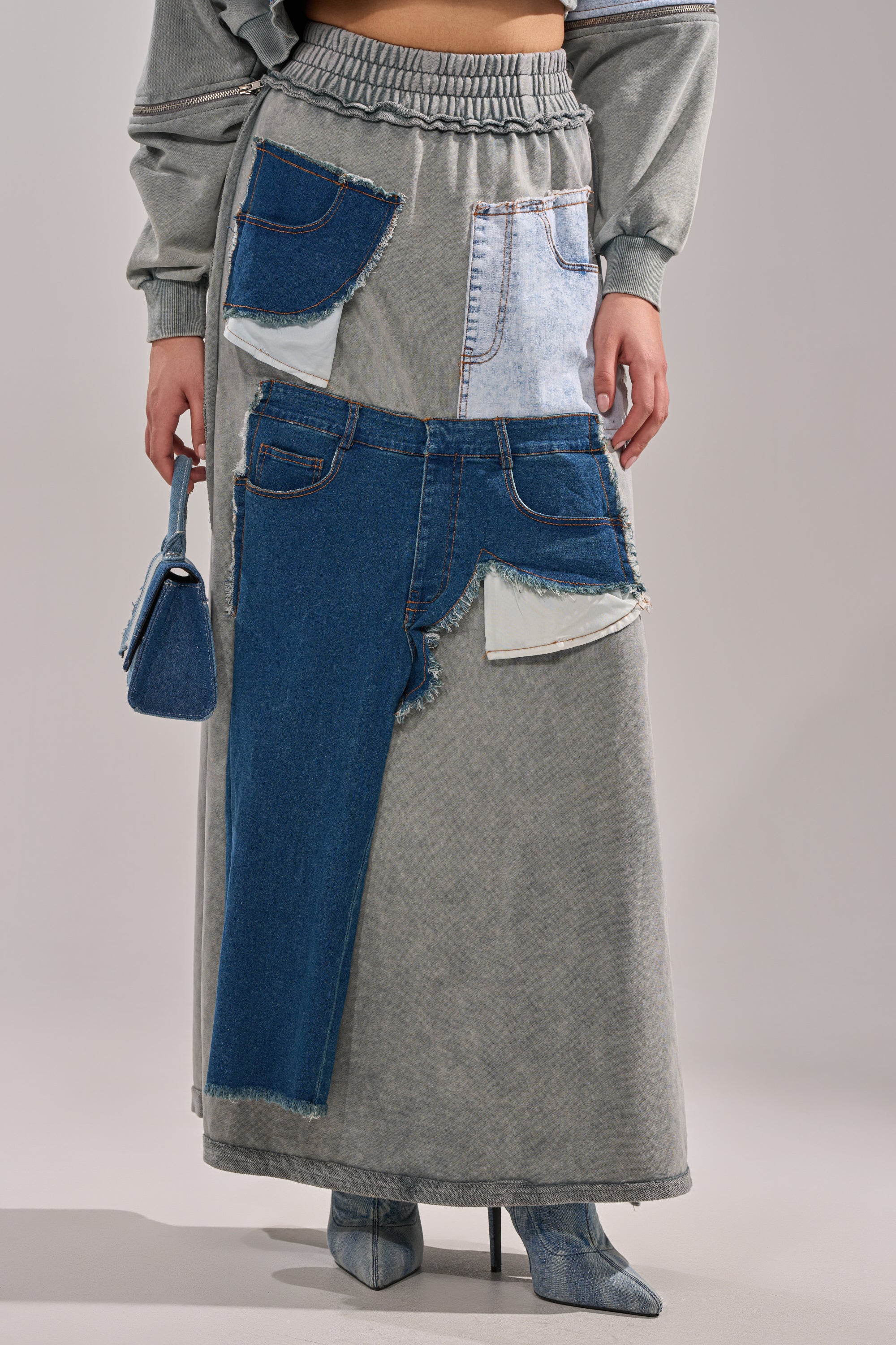 The AKIRA Label Denim Dreams Maxi Skirt is made from a cotton blend base fabrication and consists of denim patchwork detailing throughout. This unique piece features a maxi length silhouette with a side slit for mobility, a scrunched elastic waistband, a 4-pocket design, and a pull-on fit. Finish off the fit with the matching top, The AKIRA Label Denim Dreams Zipper Detail Sweatshirt.