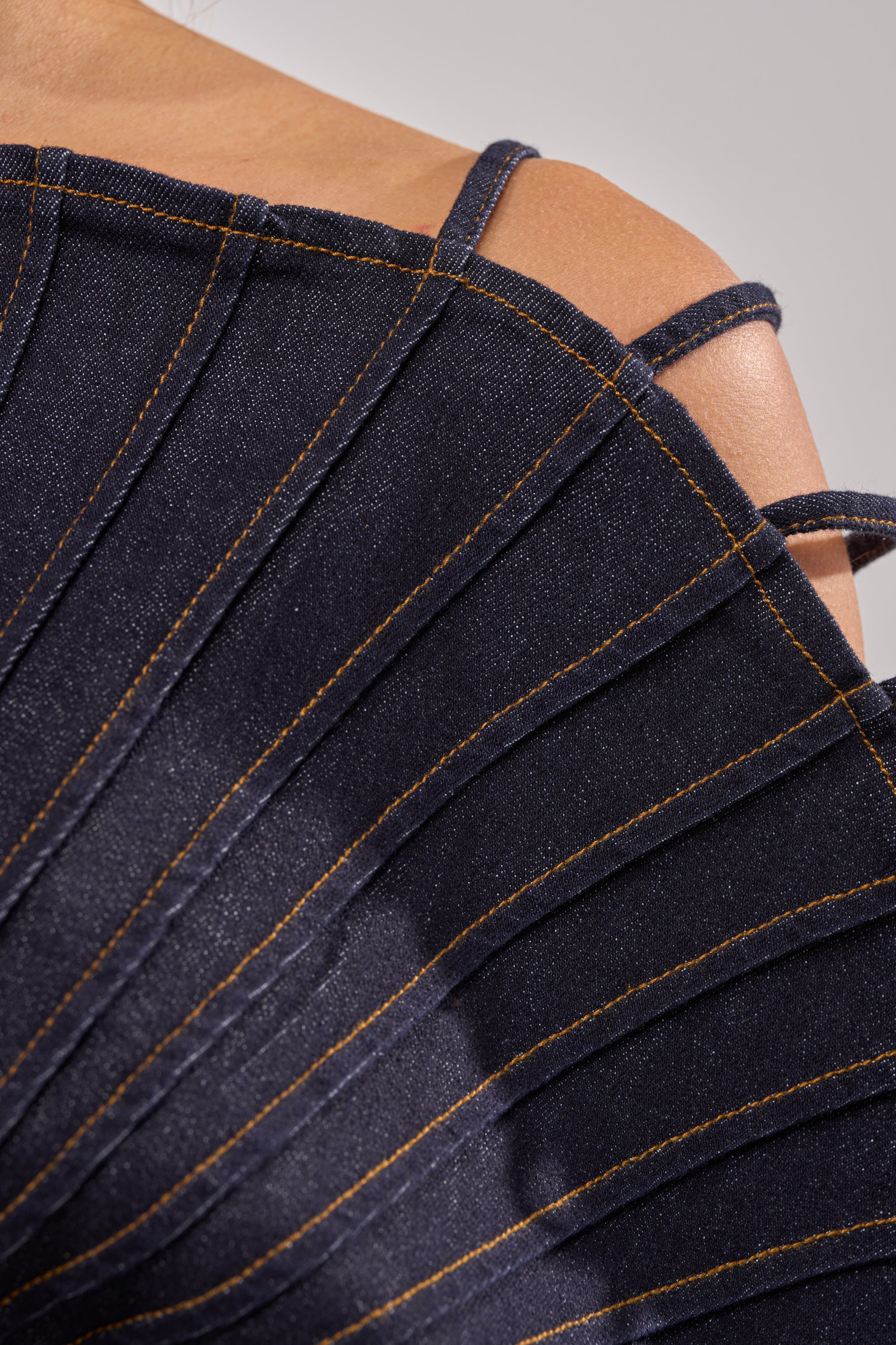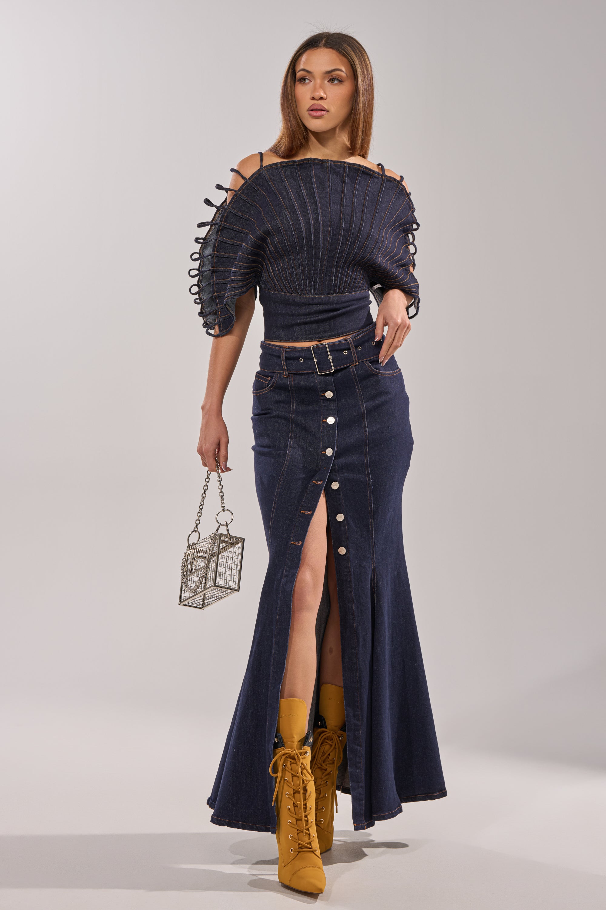 Architectural denim fan top with cutout detailing designed for a bold, fashion-forward statement. Crafted from structured dark denim, this piece features dramatic sculptural sleeves with looped detailing, a fitted waist panel, and a pleated fan-style front for striking dimension. The open back with a top connecting strap and lower back silver hardware zipper enclosure design adds contrast and allure while maintaining a tailored silhouette. Perfect for editorial styling, runway-inspired looks, or elevated casual wear paired with sleek bottoms and statement footwear.