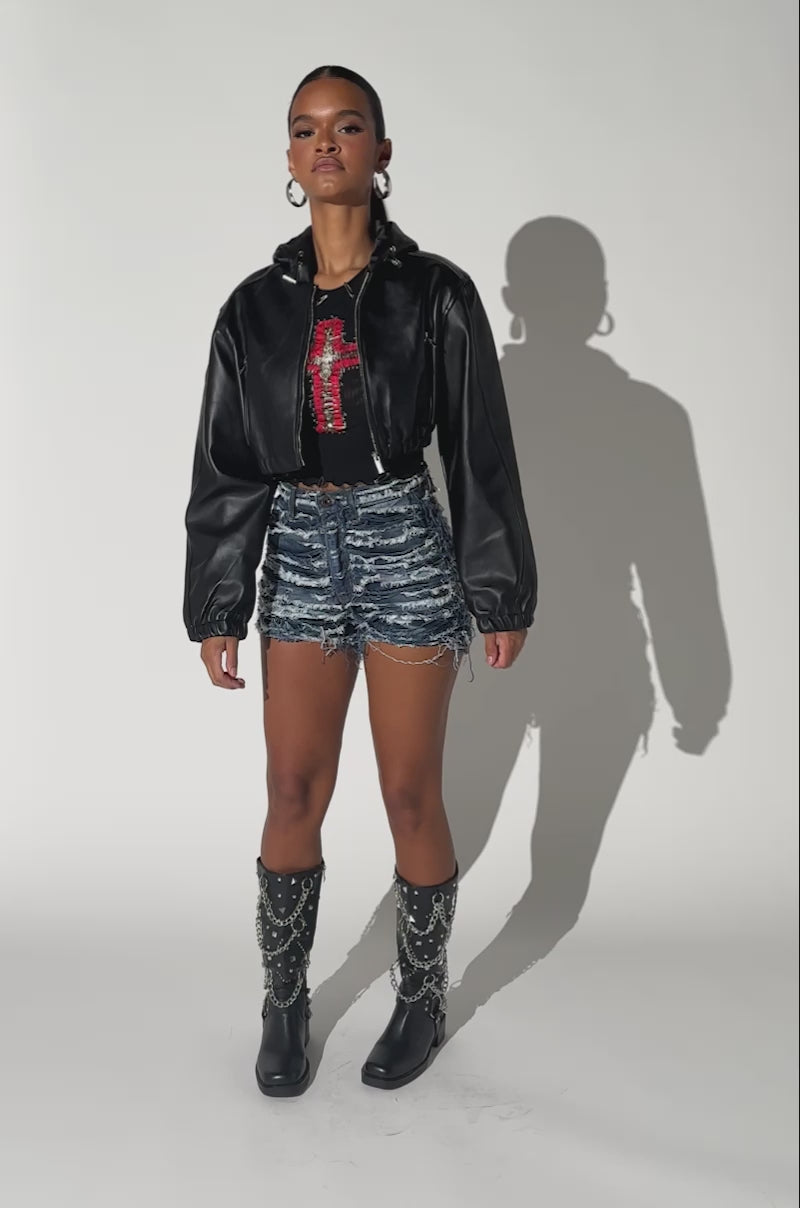 Simply sexy. Crafted from subtly pebbled, supple faux leather, The AKIRA Label Dex Hooded Bomber is the perfect addition to your coat closet. It features a cropped, classic bomber-style silhouette with an elasticized waistband and coordinating sleeve cuffs, two metallic silver zipper pockets, a coordinating zip front closure, and an attached hood with adjustable bungee cords. It’s complete with tonal stitching throughout and a slick inner lining. Wear it with jeans and stiletto boots for an understated albeit luxe finish.