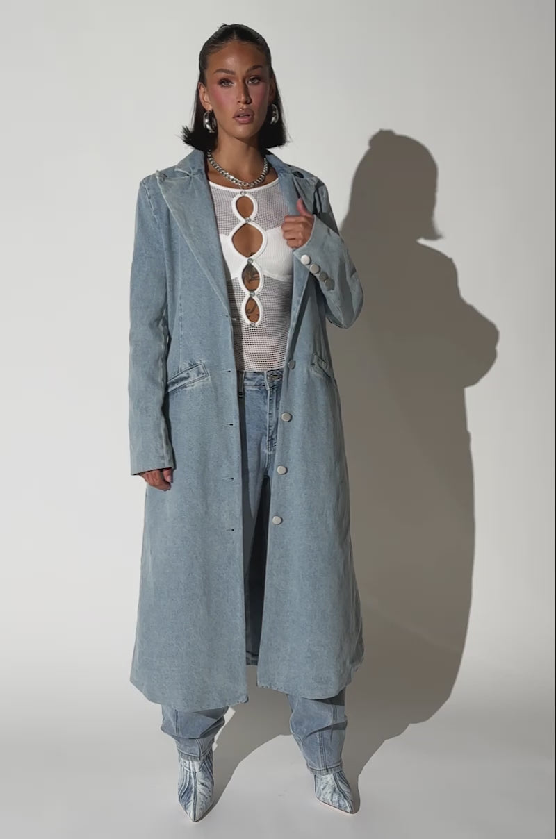 It’s always the perfect time to wear The AKIRA Label Divine Timing Denim Duster. This understated, longline jacket is crafted from soft and supple light wash denim and features an oversized, relaxed silhouette, a plunging neckline with a notch lapel collar, a metallic silver button front closure, and buttoned cuffs. It’s complete with a slick inner lining, decorative, faux pockets at the waist, and a rear split seam to ensure comfort and mobility.