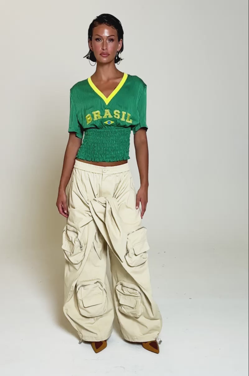 You can never be too extra in The AKIRA Label Do The Most Tie Front Pant. These ultra-wide cargo pants are crafted from a durable, non-stretch cotton and features a high-rise fit, a shirred elastic waistband, side slant waist pockets, additional oversized zippered pockets on the thighs and calves, a unique self-tie detail that wraps across the front, and bungee cord closures on the pant hemlines for an optional cinched silhouette. Complete with a standard button-zip front closure, and a baggy, exaggerated volume. Perfect for styling standout streetwear fits, editorial moments, or avant-garde off-duty looks.
