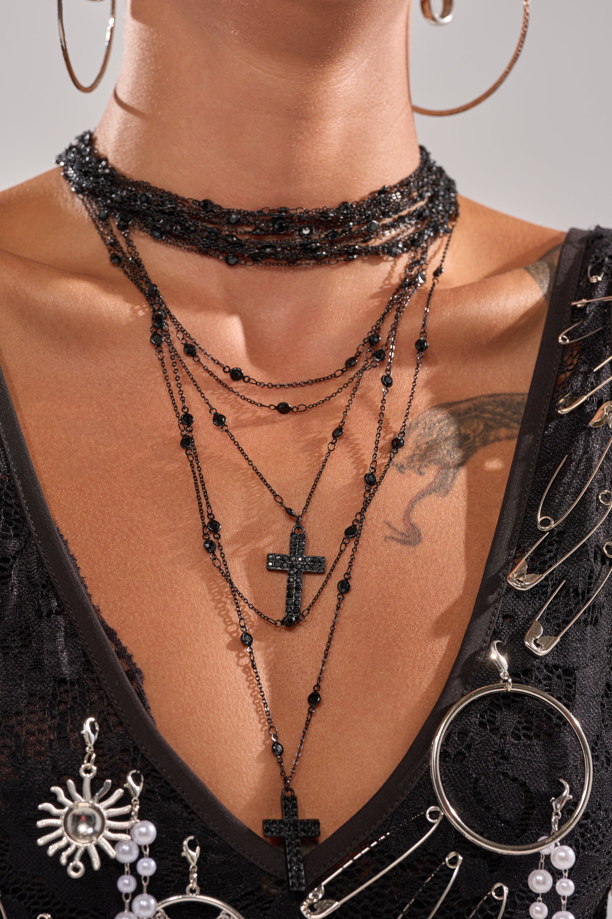 It’s gettin’ goth in here… The AKIRA Label Dolce Layered Necklace adds a darkly romantic edge to any look. Featuring multiple strands of fine black chains adorned with delicate beads, this design layers effortlessly for a dramatic, vampy vibe. Two black cross pendants anchor the look, creating balance and depth across the neckline. Complete with an adjustable lobster clasp closure.