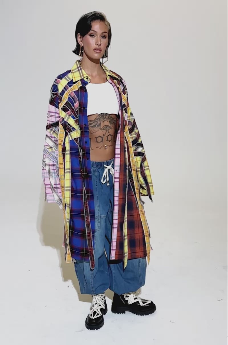 Pretty in punk with The AKIRA Label Don’t Even Mixed Plaid Long Button Down. This oversized button-down shirt features a patchwork of multi-colored plaid flannel with deconstructed strip overlays and raw-edge seams. A classic collar, long sleeves, and a knee-length silhouette add utility, while the unexpected back panel contrast and asymmetric cuts push the limits of grunge style. Pair it with distressed denim, chunky leather boots, and stacks of silver chain jewelry an androgynous grunge-glam look.