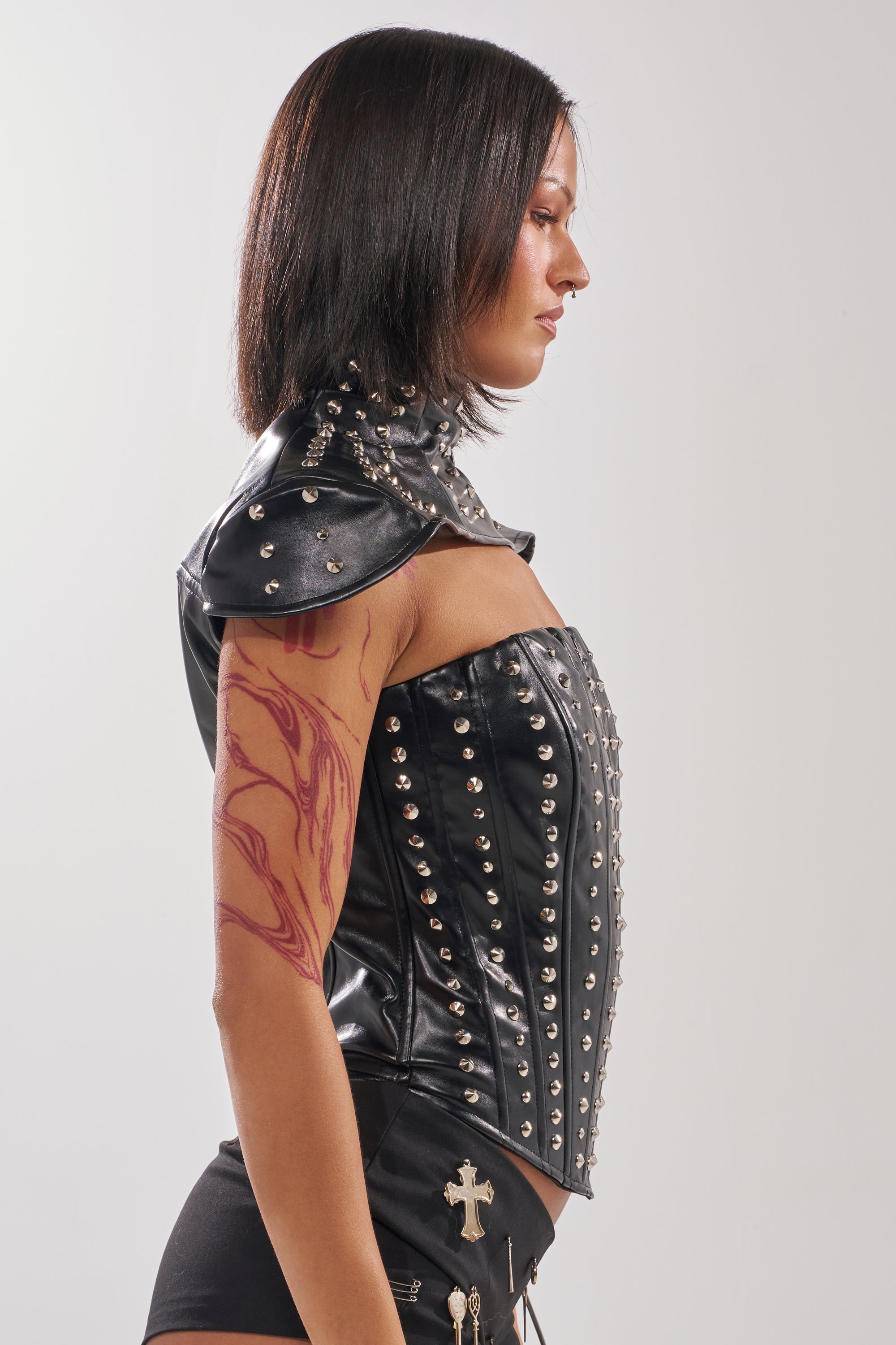 Beware! Spikes may be closer than they appear with the AKIRA Label Don’t Hug Me Faux Leather Corset. This black faux leather spiked corset top delivers extreme edge with its silver studded and spike-embellished design, featuring vertical rows of metallic hardware that sculpt the body to create an armored aesthetic. Built with structured boning for a defined silhouette and back zipper enclosure for easy access, the corset includes a dramatic high-neck shoulder piece covered in matching spikes for a bold, cohesive statement. Pair with a simple black pant and combat boots for the perfect fierce look.