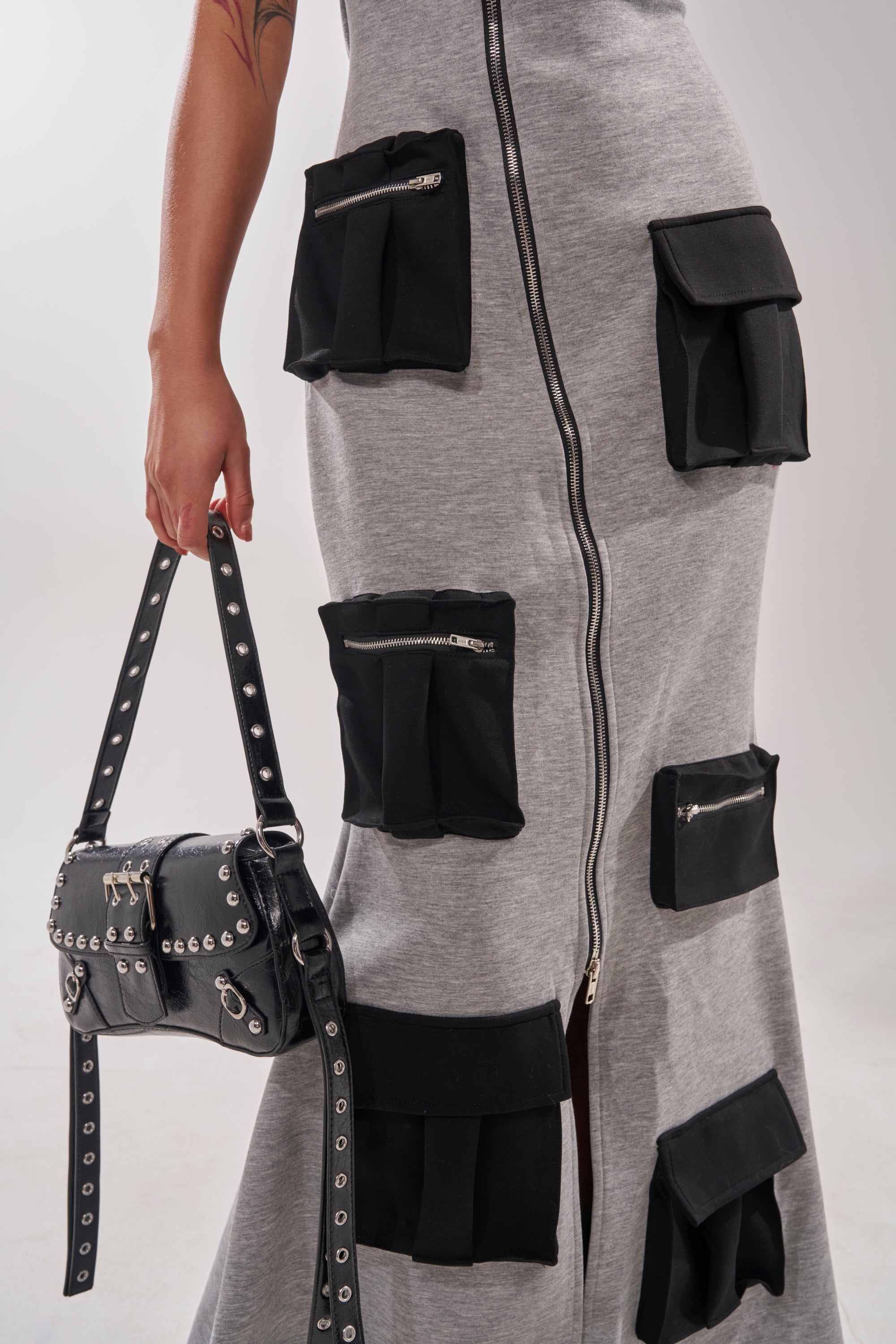 Statement-making high-neck utility maxi dress with bold zip-front styling, perfect for nights out, street style moments, or an elevated edgy look. Featuring a sleek curve-hugging silhouette with a structured high collar, this standout dress brings major attitude with its full-length front zipper for customizable coverage and a sultry slit effect. Finished with contrast cargo-inspired pockets and zipper accents for a fashion-forward, modern edge, this piece features an elasticized waist for extra comfort. Pair with pointed heels or chunky boots and a mini bag for a head-turning fit.