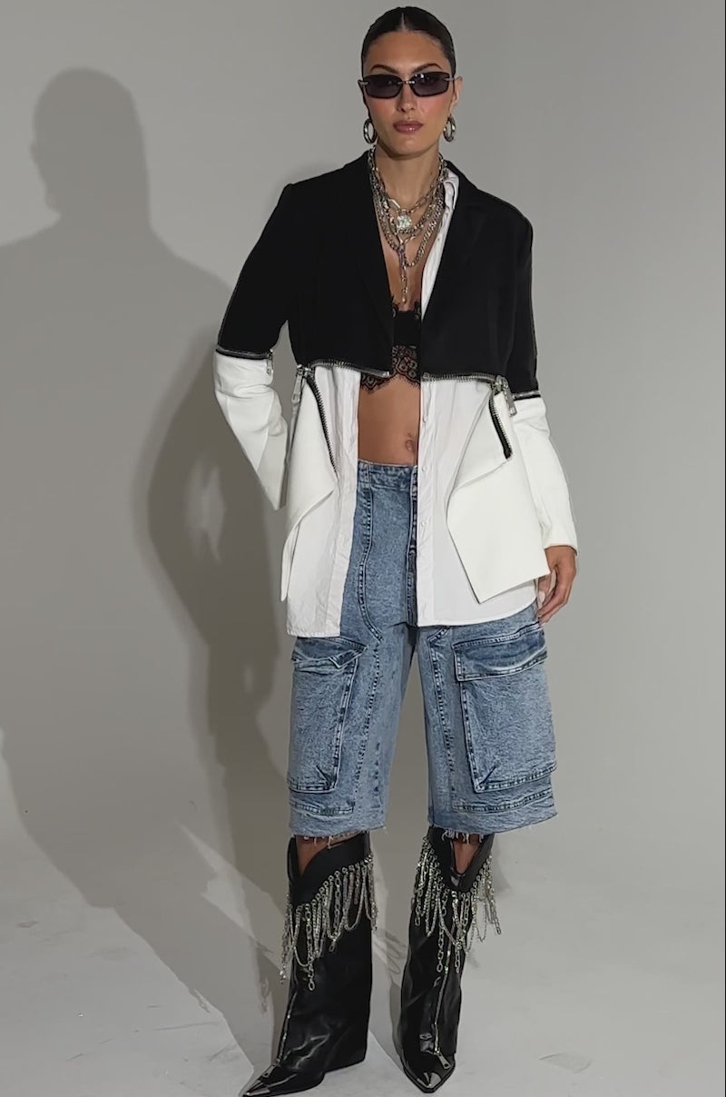 Zip into style with The AKIRA Label Don’t Trip Zipper Blazer. This dual-tone statement piece is crafted from a sleek suiting fabric with a sharp black upper half and a crisp white lower half, divided by an oversized, functional metallic zipper that wraps around the midsection. It features a notched lapel collar, subtly padded shoulders, mock waist pockets, and double-breasted snap closures on the bottom hem. Complete with a relaxed, boxy silhouette. Style with satin trousers, stiletto pumps, and a bold lip for a standout finish.