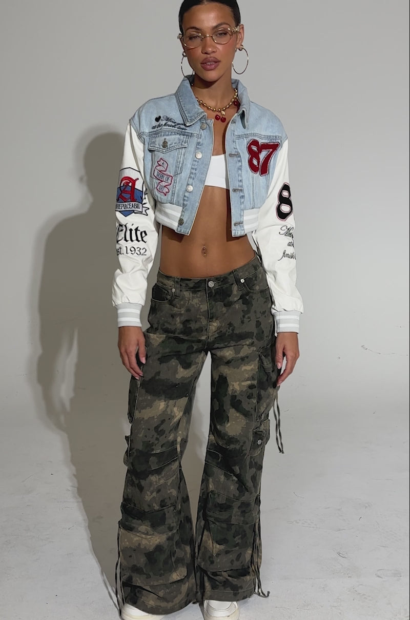 The AKIRA Label Down and Dirty Cargo Pant features a washed black and olive camouflage print on durable, semi-stretchy denim. They feature a high-rise, relaxed silhouette, oversized flap cargo pockets at the thighs and knees, and adjustable drawstring pulls at the hem for customizable volume. The stacked panel construction and heavy seam detailing add texture and structure. Finished with a zip-button front closure, five classic pockets, and functional belt loops, these cargos blend utilitarian function with streetwear swag.