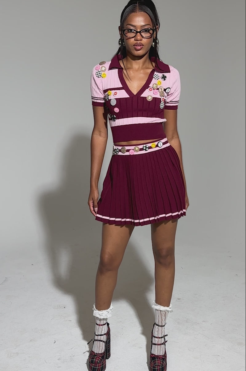 The AKIRA Label Dreke Knit Polo is a playful twist on a preppy classic. Designed in burgundy and pink ribbed knit, this cropped polo features a sharp collar and deep V-neckline for a modern edge. Decorative pins and patches add a quirky, statement-making finish, giving this top a fun, rebellious vibe while keeping its sporty-casual feel. Pair with the coordinating Dreke Knit Pleated Mini Skirt for a perfectly preppy finish.