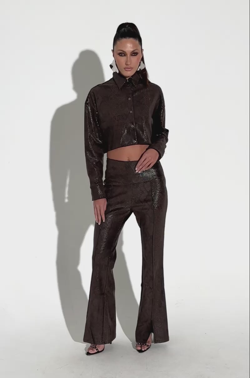 It’s gettin’ hot in here! The AKIRA Label Drop It Low Pant With Slit is crafted from a slightly stretchy, luxe faux leather base with an embossed crocodile pattern throughout, a high rise design, a wide waistband, contour seaming, a subtle slit detail on the bottom of both pant legs, and a metallic back zipper closure. Complete with a flared silhouette. Pair with a skin-tight corset, a cropped leather jacket, and stiletto pumps for a sultry finish.