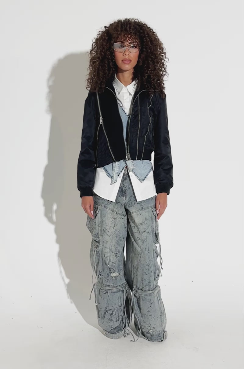 Stay chic all winter long in The AKIRA Label Duke Zipper Detail Bomber. This contemporary outerwear piece is crafted from a sleek knit base and features a ribbed knit mock collar with a coordinating ribbed knit panel running down one side of the front bodice, a paneled construction, long sleeves with ribbed cinched cuffs, a coordinating cinched waistband, and non-functional metallic zipper accents with one functional zipper that exposes a pinstripe pattern interior, and side slant front pockets. Complete with a traditional pinstripe pattern throughout the back, a front zipper closure, and a boxy, cropped fit. Pair with cargo pants and loafers for an effortlessly cool ensemble.