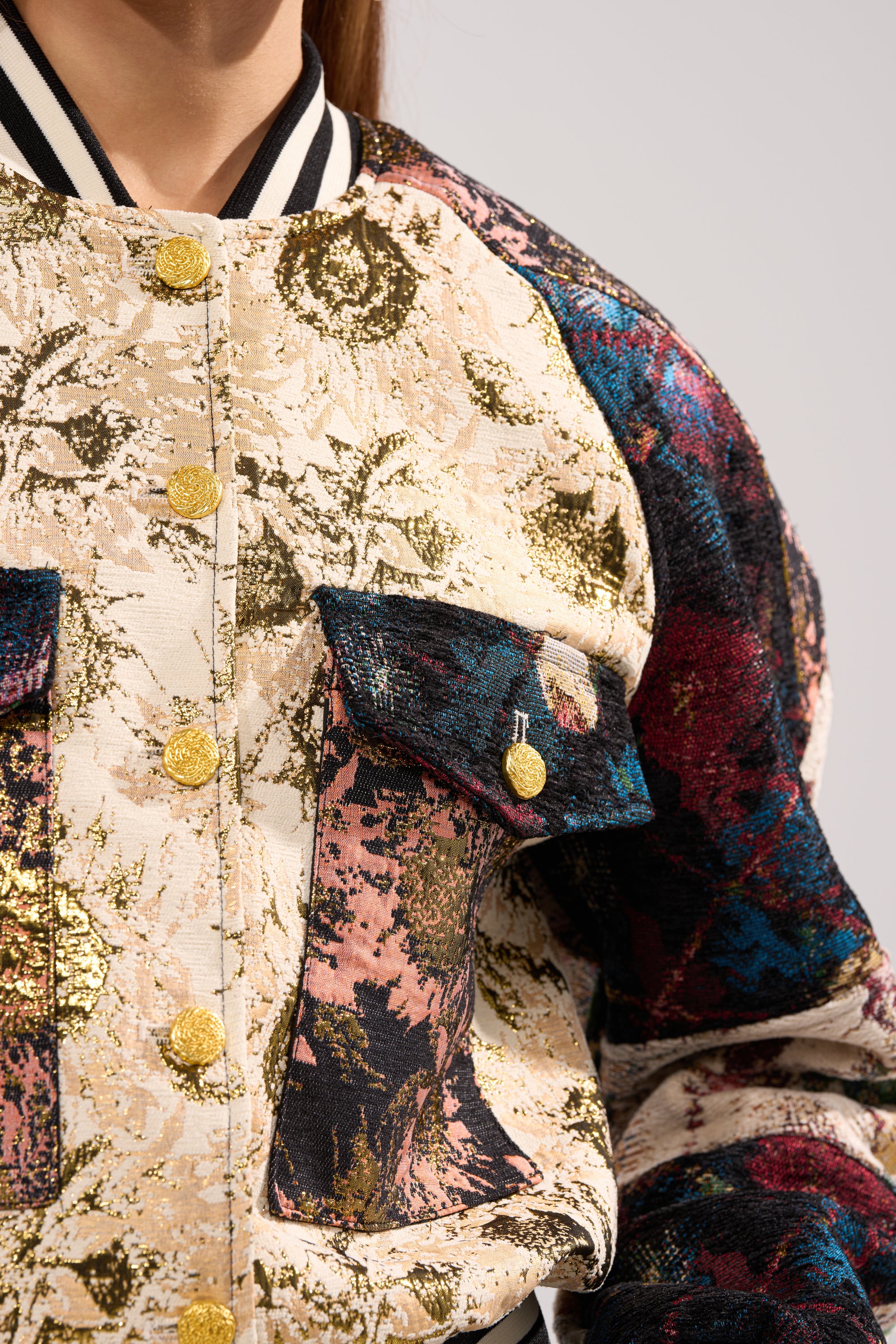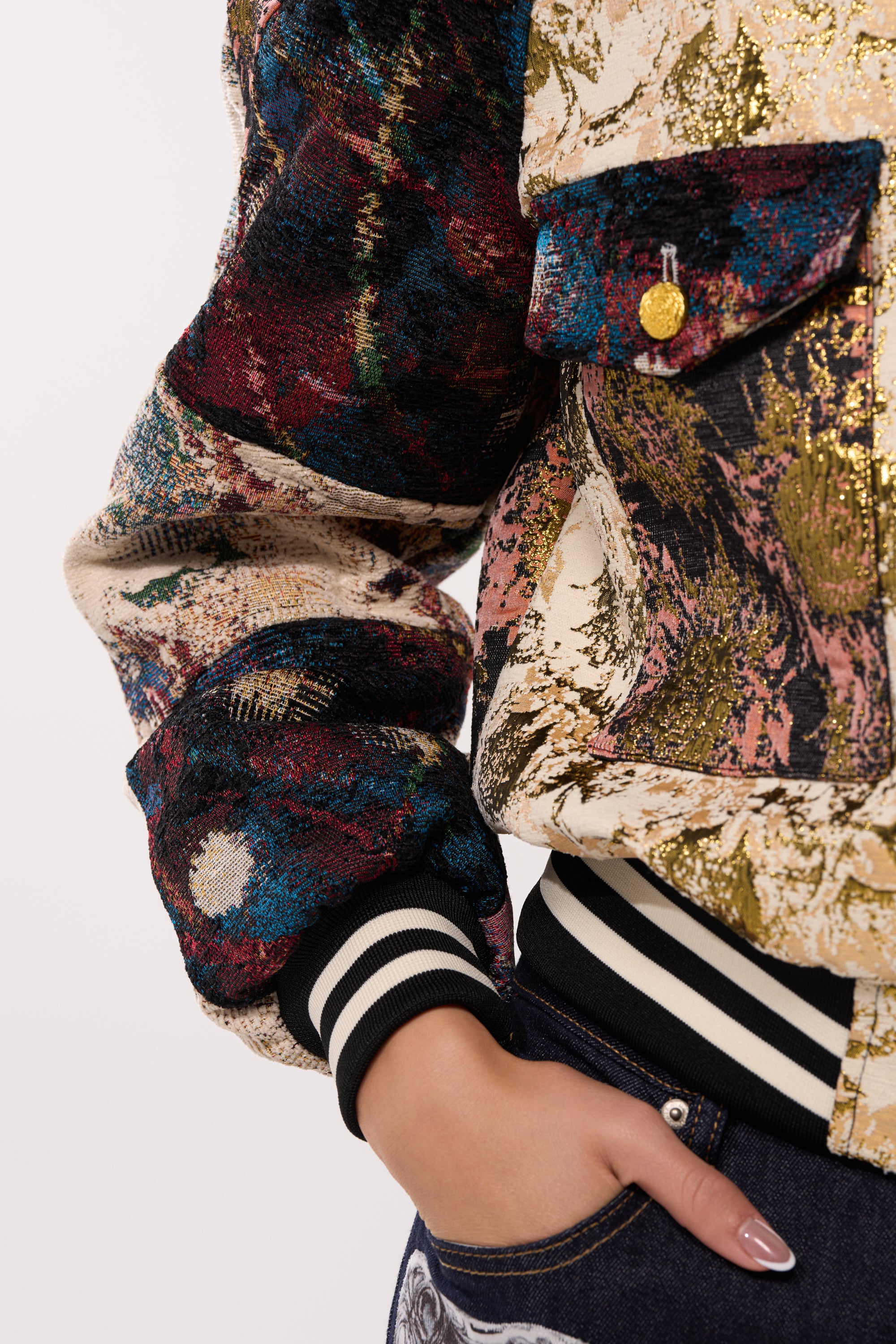 This elevated sporty-chic metallic brocade bomber jacket is crafted from a richly textured woven fabric with a funky, patchwork pattern. It features a classic varsity-style striped collar and cuffs, long sleeves, embossed gold-tone hardware, a button-front closure, and oversized flap pockets on the chest. Complete with a slightly oversized, boxy fit. Style it with a sleek bodysuit or a mini pleated skirt to let the jacket steal the spotlight.