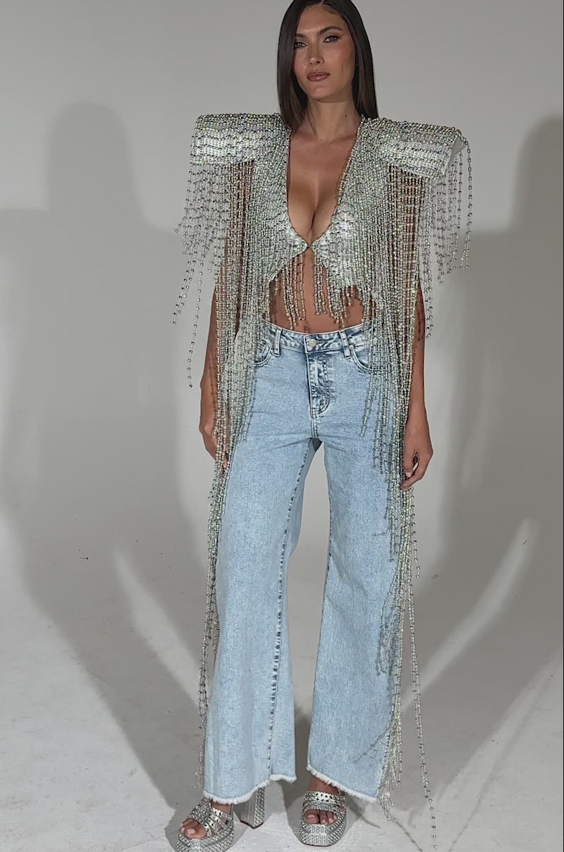 The AKIRA Label Essential Relaxed Fit Bling Denim Jeans is a must-have for your going-out wardrobe. Crafted from slightly stretchy, light-wash denim, these luxe bottoms feature a high-rise fit, functional belt loops, a classic five-pocket design, a button-zip front closure, and thigh-high side slits on the pant legs lined with sparkling, cascading rhinestone trim detailing. Complete with a relaxed, wide-leg silhouette. Try pairing with a corset, platform pumps, and a metallic clutch for a fabulous finish.
