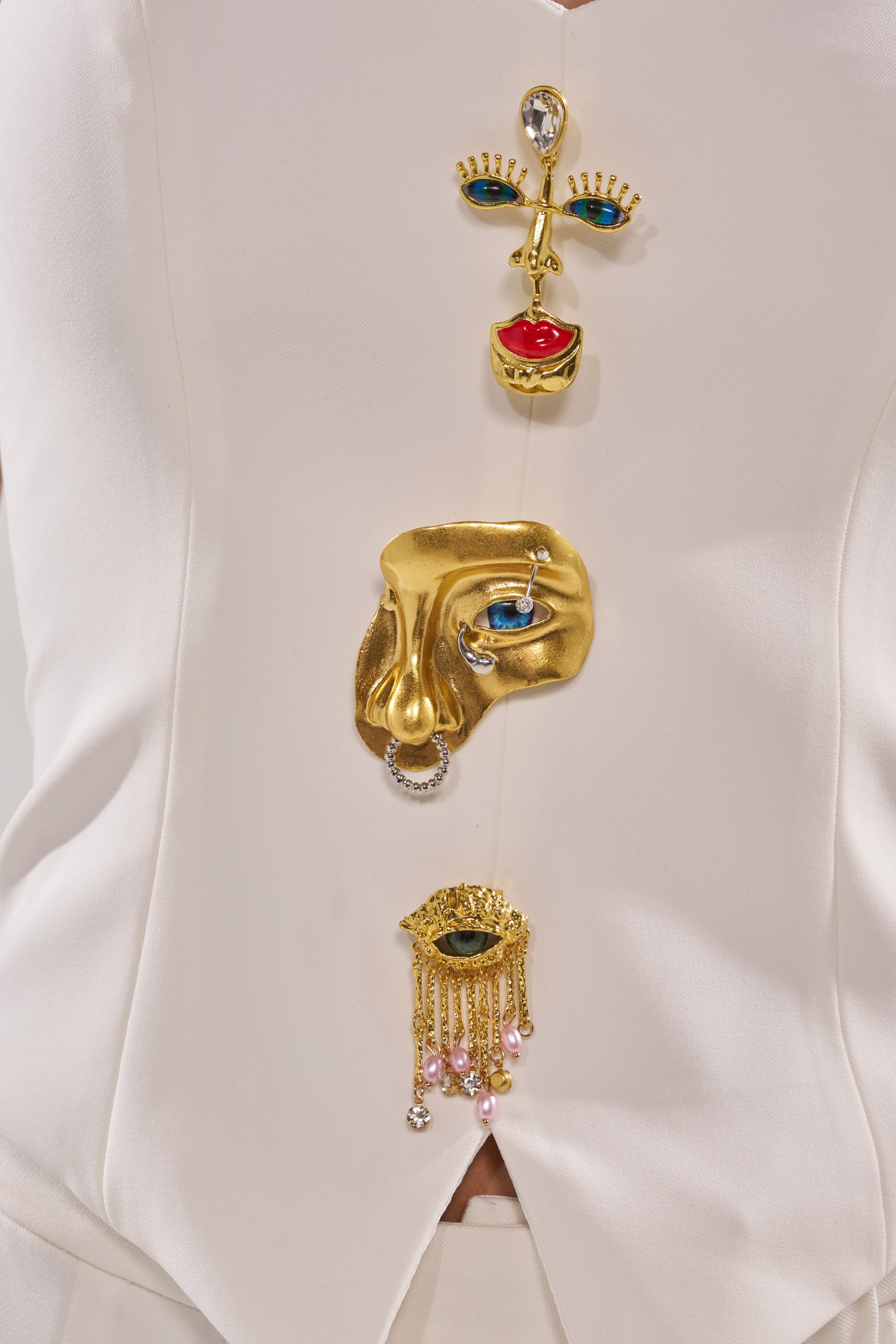 Eye spy a fashion icon! The AKIRA Label Eye Got My Eyes on You Pin Detail Corset Top is crafted from a sleek, luxe fabric and features a corset-style bodice, a halter-style strap, a sweetheart neckline, a pointed hemline, and three gold-tone, 3D sculptural body-themed pins running down the front. Complete with a metallic back zipper closure. Try styling with the coordinating AKIRA Label Eye Got My Eyes On You Pin Detail Tailored Blazer, a mini skirt, and platform pumps for a unique, artistic finish.