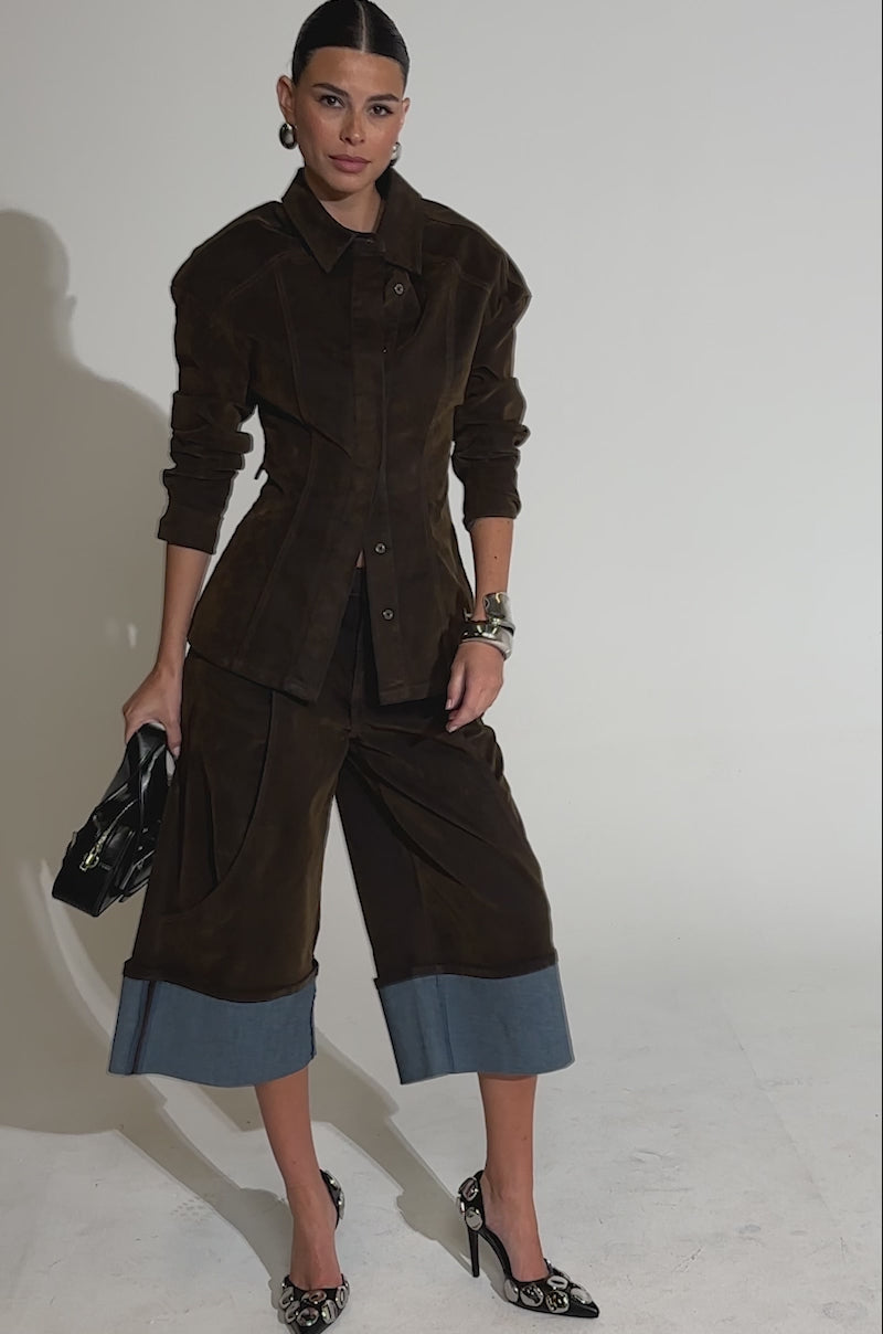 It’s never too early to start shopping for fall fashion. The AKIRA Label Fall Vibes Velvet Denim Button-Down is crafted from structured, semi-stretchy denim with a soft, velvety brown finish. It features a slightly oversized, boxy silhouette, contour seaming, a pointed collar, a concealed button-down front placket, and long sleeves with buttoned cuffs. Pair it with the coordinating Fall Vibes Velvet Denim Bermuda Shorts and chunky work boots for an effortlessly edgy, androgynous ensemble.