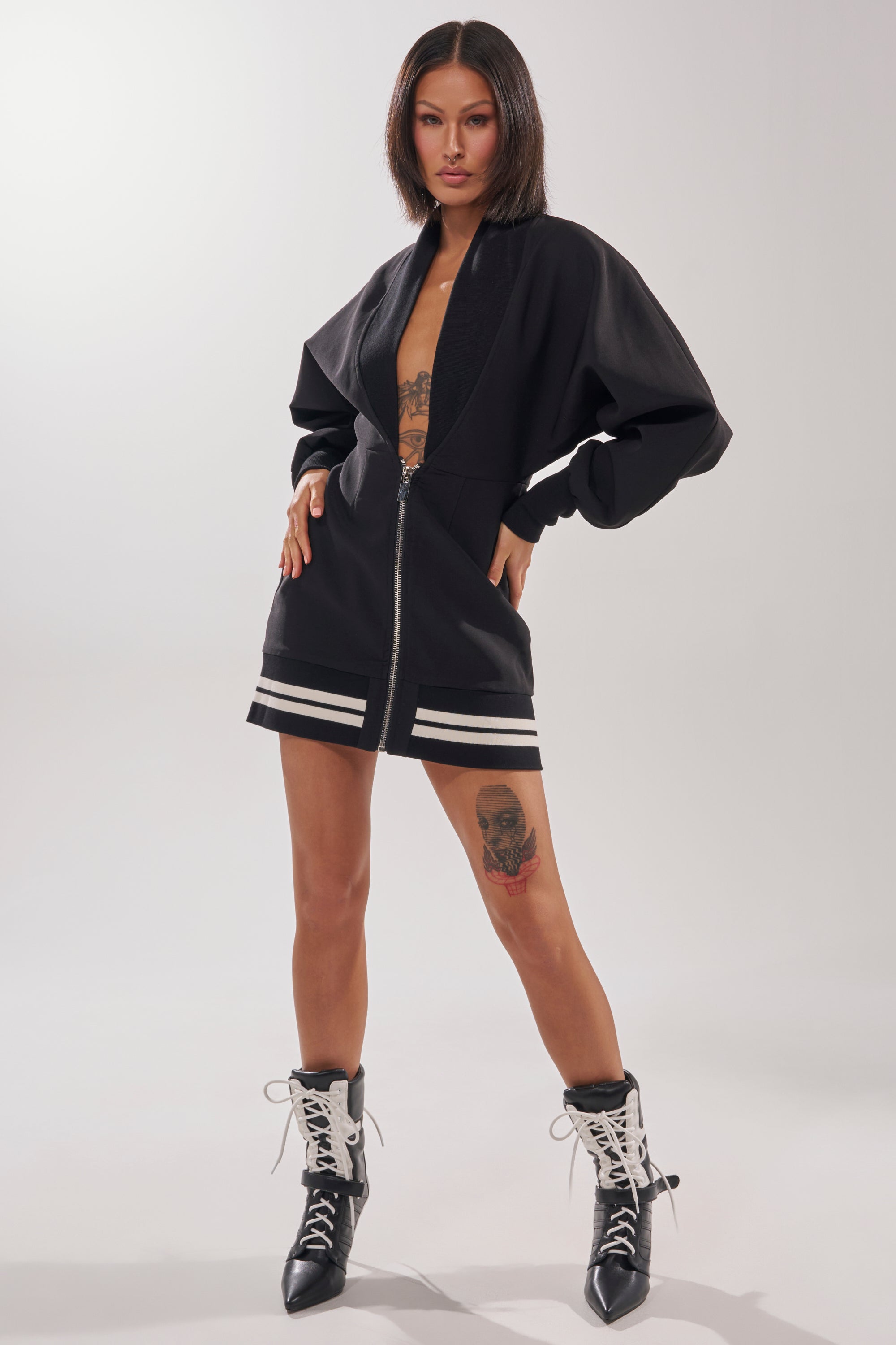 Living life in the fast lane! The AKIRA Label Fast Lane Mini Dress combines sporty edge with modern minimalism, featuring a deep plunging neckline framed by a soft, oversized shawl collar and long, slightly voluminous sleeves for a relaxed yet elevated silhouette. Crafted from a smooth, black, structured fabric, the dress includes a full-length exposed silver hardware zipper, black ribbed knit bands along the wrist and neckline, and contrasting white athletic-style stripes along the hem for a chic varsity-inspired finish. Pair with an over-the-knee black heeled boot for a sporty chic look.