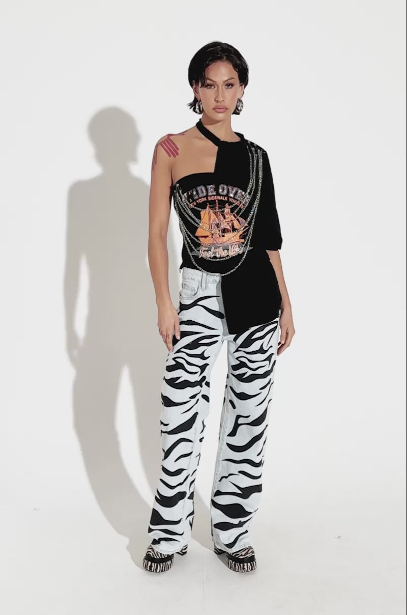 Your baddie factor will rise exponentially in The AKIRA Label Feel The Vibe Tee. This unique top is crafted from a lightweight cotton and features an asymmetrical, half-shirt silhouette. It boasts a crew neck collar, with one short sleeve, an exposed arm on the other side, a coordinating tube top overlay with inner elastic trim, a contrast boat graphic and text across the chest, and an asymmetrical bottom hem. Complete with rows of faux silver metallic chain links and paper clip embellishments that start at the shoulder and drape across the bodice. Pair with baggy cargo jeans and platform pumps for a finished look.