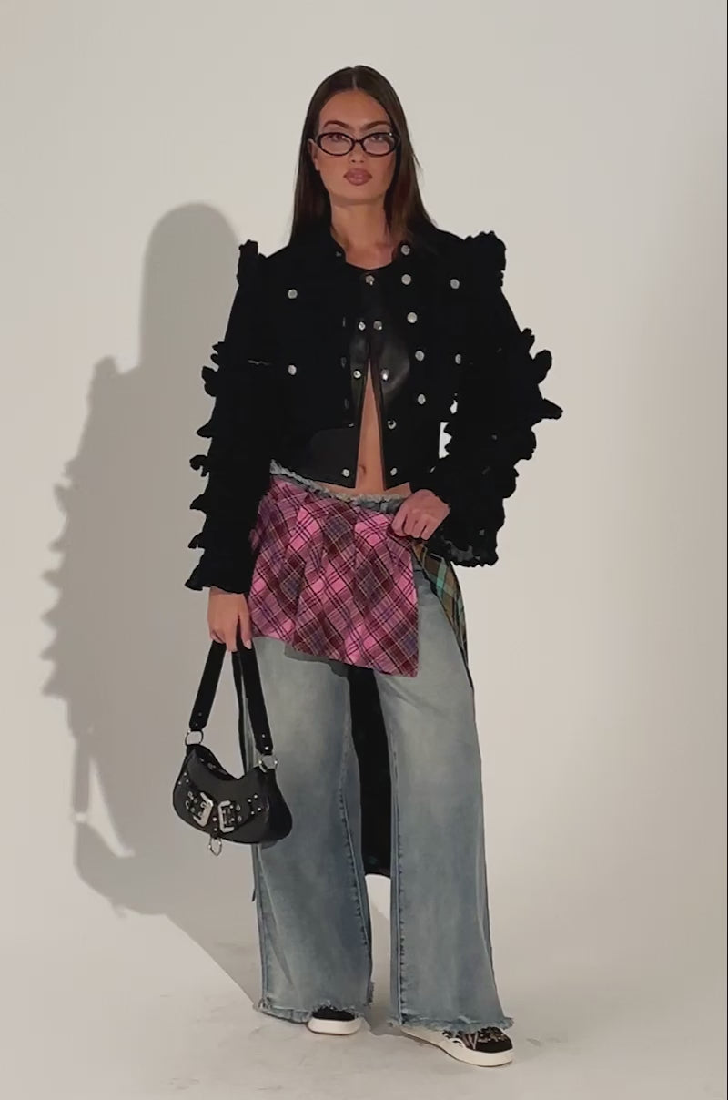 You are a denim dream in The AKIRA Label Felicity Statement Sleeve Denim Jacket. This unique outerwear piece is brought to you in a slightly stretchy cotton blend dark wash denim base and features a pointed collar, faux silver metallic hardware, long flared sleeves with panels of ruffle trim, coordinating ruffle trim at the shoulders, and four fold-over button chest pockets. Complete with classic button down front closures, and a boxy, cropped silhouette. Pair with dark wash jeans and pointed stiletto boots for a daring ensemble.