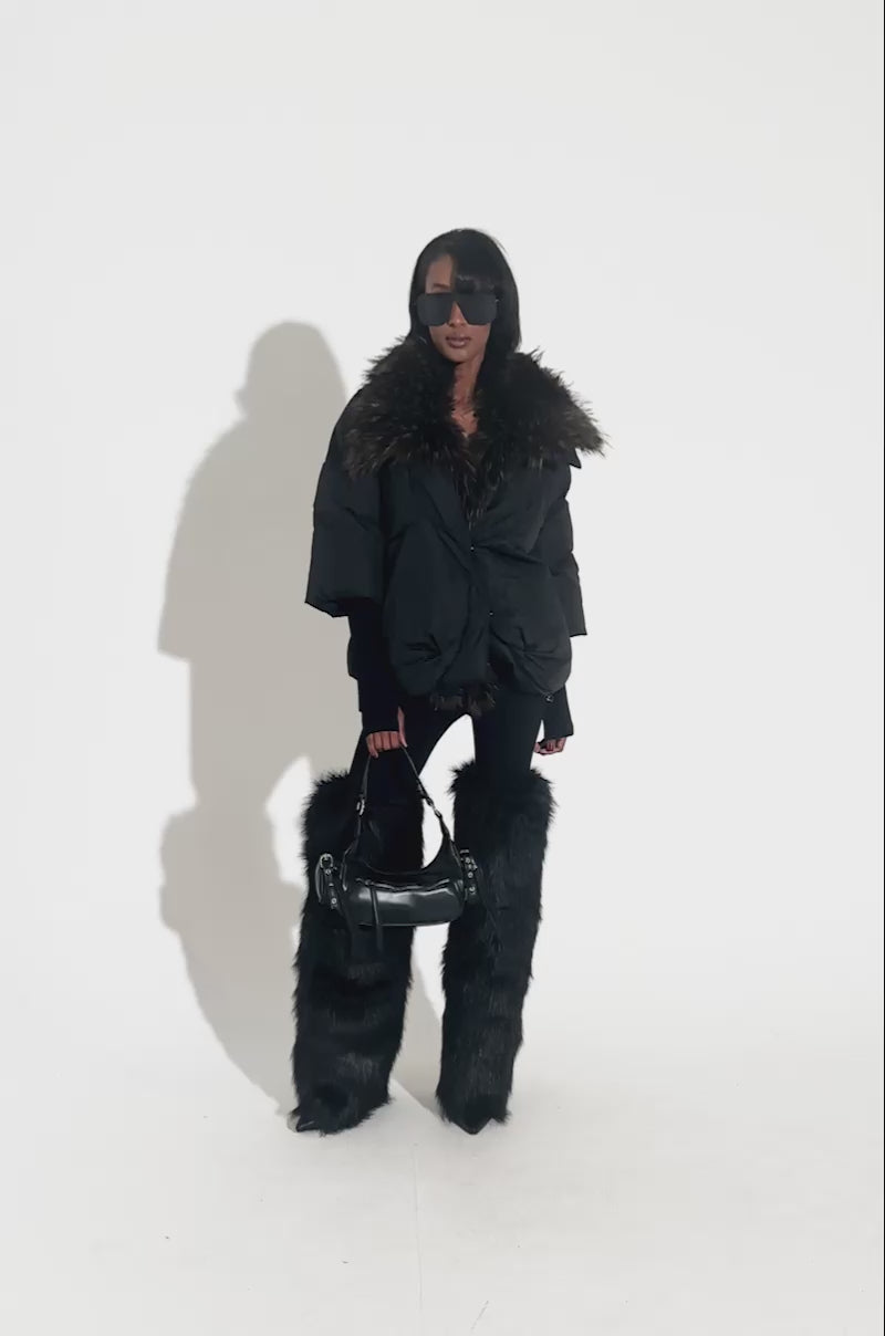 Keep snuggly on a cold winter’s day with The AKIRA Label Fireside Fur Trim Puffer. This chic outerwear piece is crafted from an ultra-warm puffer base and features a detachable, oversized plush faux fur trim pointed collar, long ribbed knit sleeves, bungee cord closures on the bottom hem for an optional cinched look, and a sleek inner lining. Complete with zippered side pockets, one inner pocket, concealed snap button front closures, and an oversized, waist-length silhouette. Pair with leggings and fur booties to cozy up next to the bonfire.