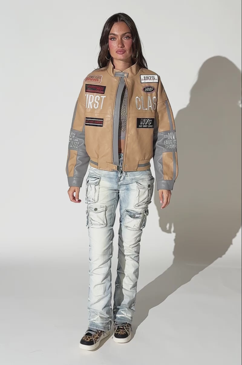 Feelin’ like a VIP in the skies with The AKIRA Label First Class Embroidered Moto. This sleek outerwear is crafted from a faux leather base and features colorblock contrast trim throughout, a standing collar with a contrast snap button strap detail, long sleeves with snap button cuffs, sporty embroidered stitching and graphics scattered across the front, a faux silver metallic front zipper closure with a tonal snap button strap detail at the bottom hem, and a contrast quilted inner lining. Complete with contrast welted side slant front pockets, a striped ribbed knit waistband, and an oversized fit. Pair with denim and sneakers for the perfect airplane fit.