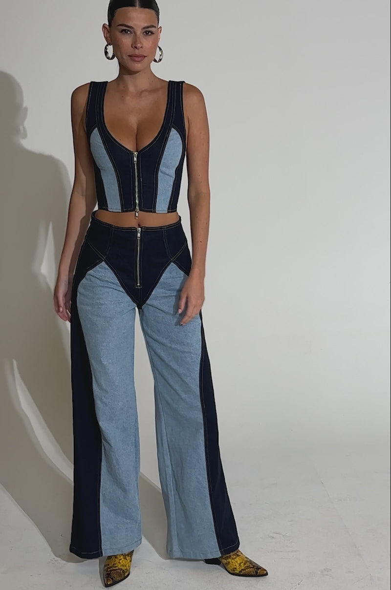 Economy who? The AKIRA Label First Class Relaxed Denim Pant is crafted from a two-tone denim of dark and light-wash denim and features a high-rise fit, a striking contrast panel design that delivers a sculpted effect, contrast seaming, and an exposed front-zip closure. Complete with a wide-leg silhouette. Style with the coordinating AKIRA Label First Class Denim Corset, cowboy boots, and chunky jewelry to saddle up in style.