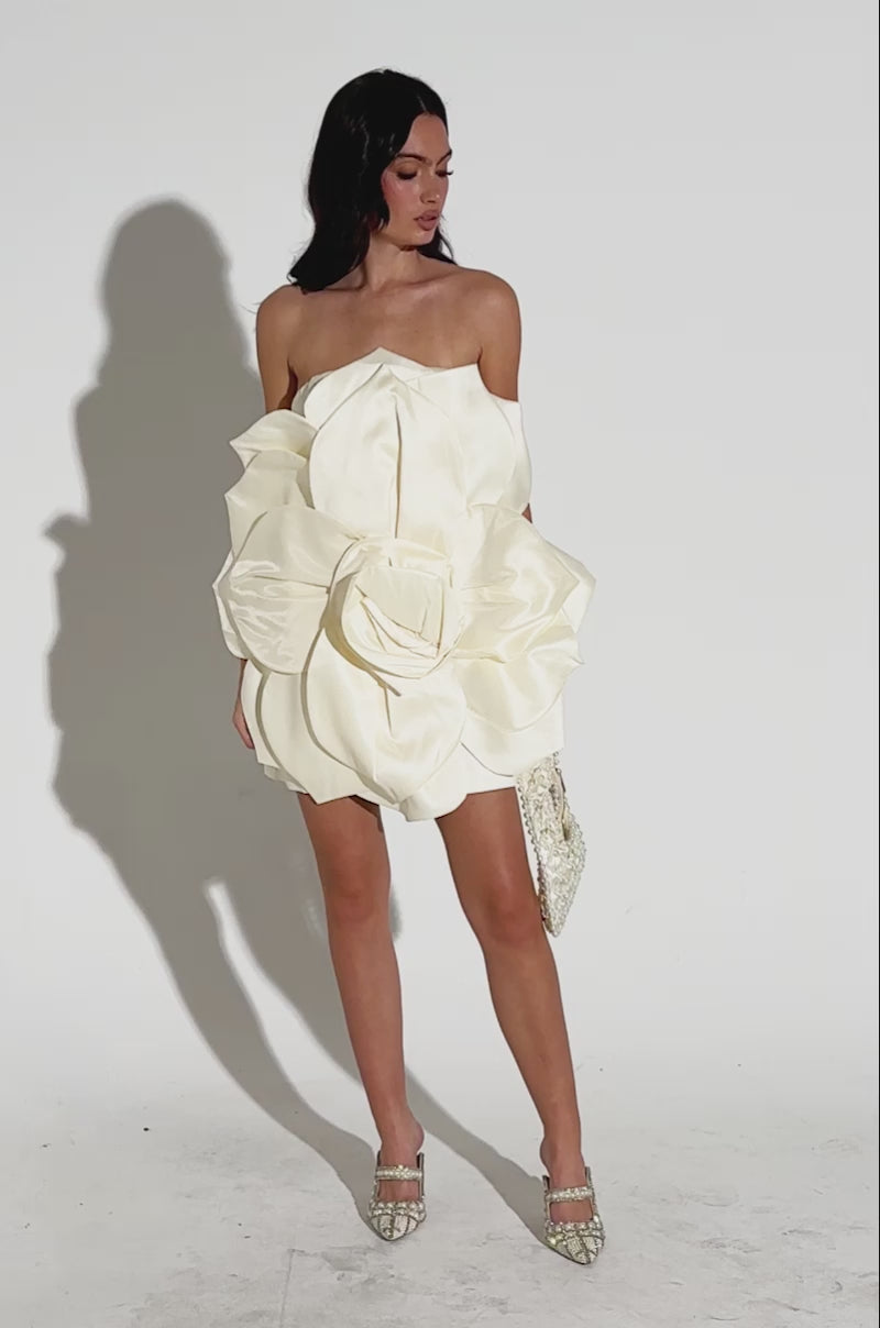 Bloom into your best self in The AKIRA Label Flower Power Mini Dress. This gorgeous statement piece is crafted from a silky smooth satin base and features a strapless neckline with inner elastic trim and an elasticized back, a sleek inner lining, and a stunning, 3D flower design that delivers a dramatic, artistic silhouette. Complete with a tonal back zipper closure, an A-line skirt, and a mini length. Pair with stiletto pumps and a bold lip for a stunning ensemble.