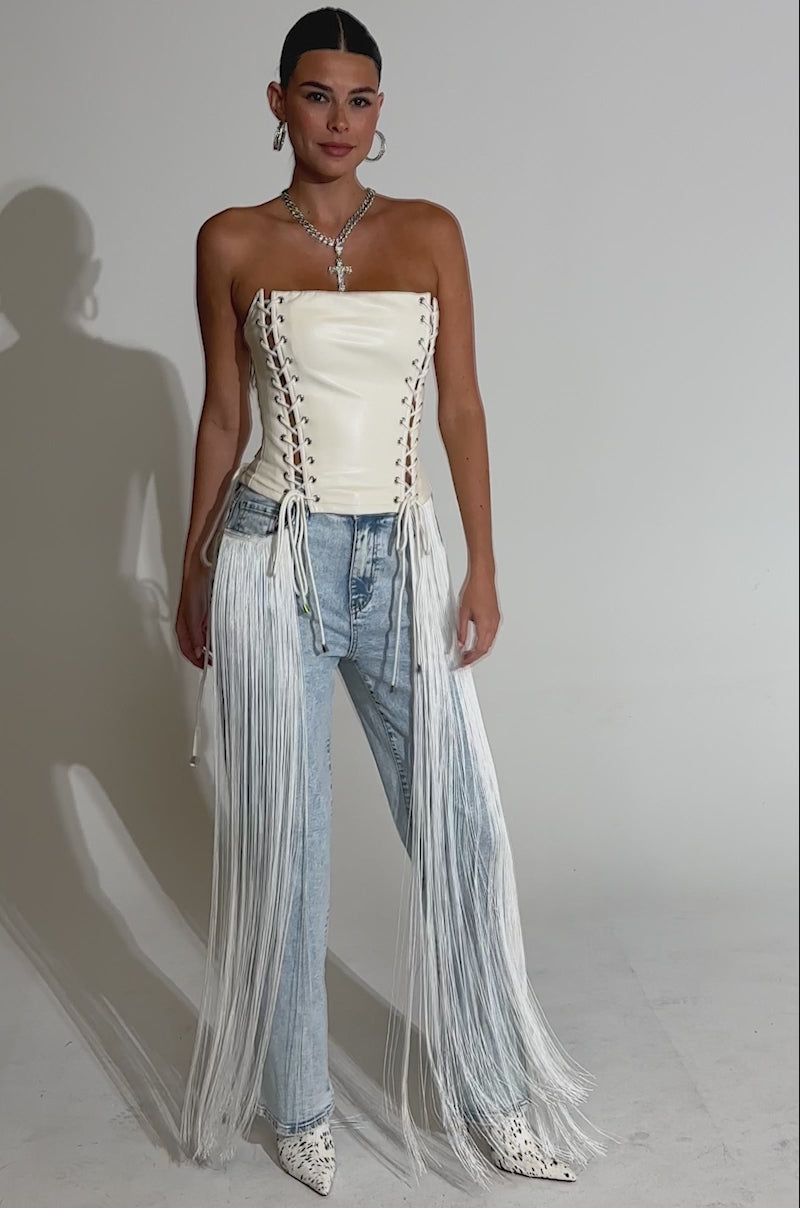 Cut loose in The AKIRA Label Flying Away Fringe Denim. These Western-style jeans are crafted from light-wash denim and features a high-rise fit, functional belt loops, a classic five-pocket design, and cascading tassel fringe detailing along the outer waist seam and pockets. Complete with a classic button-zip front closure, and a relaxed straight-leg silhouette. Try pairing with a baby tee and cowboy boots to saddle up in style.