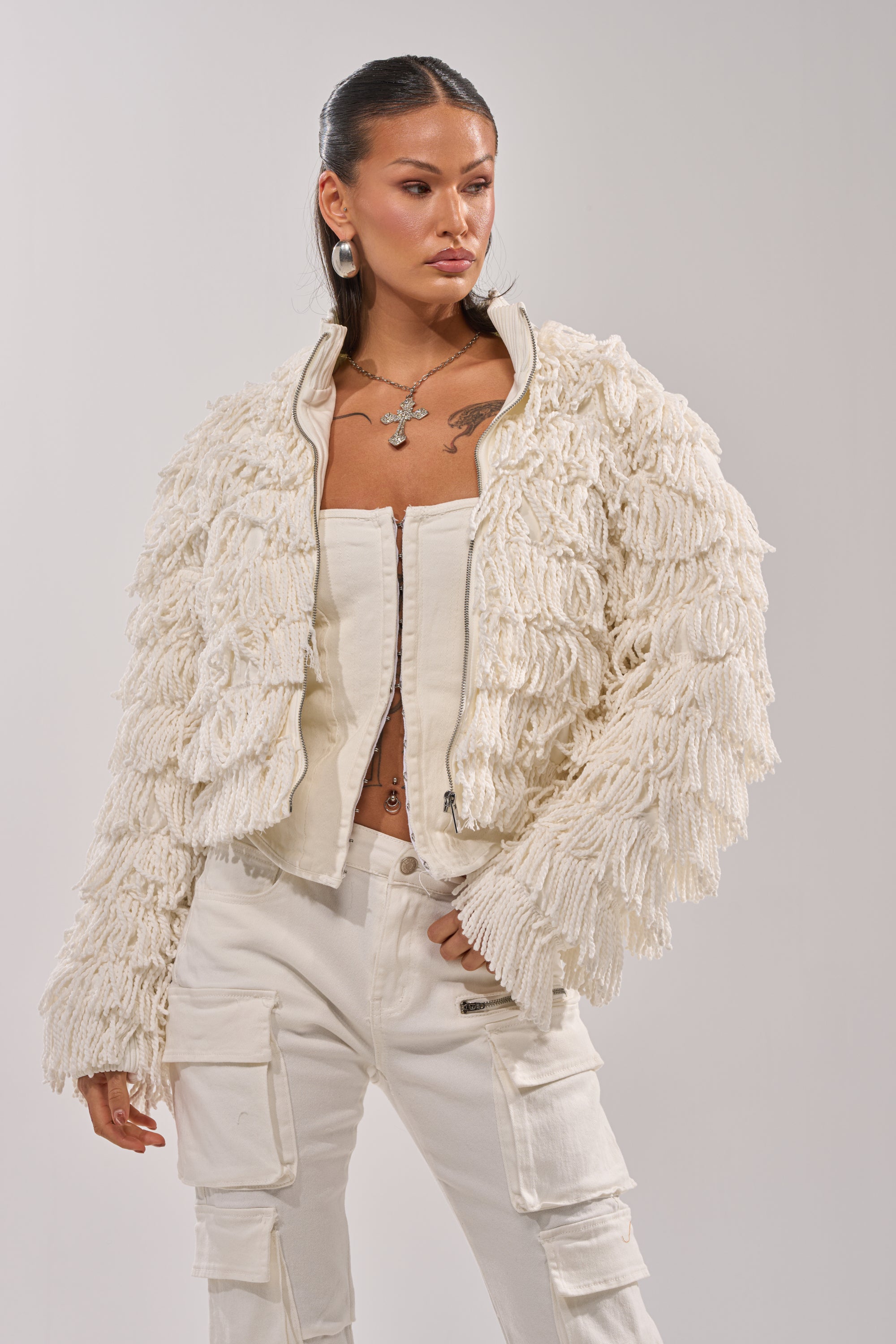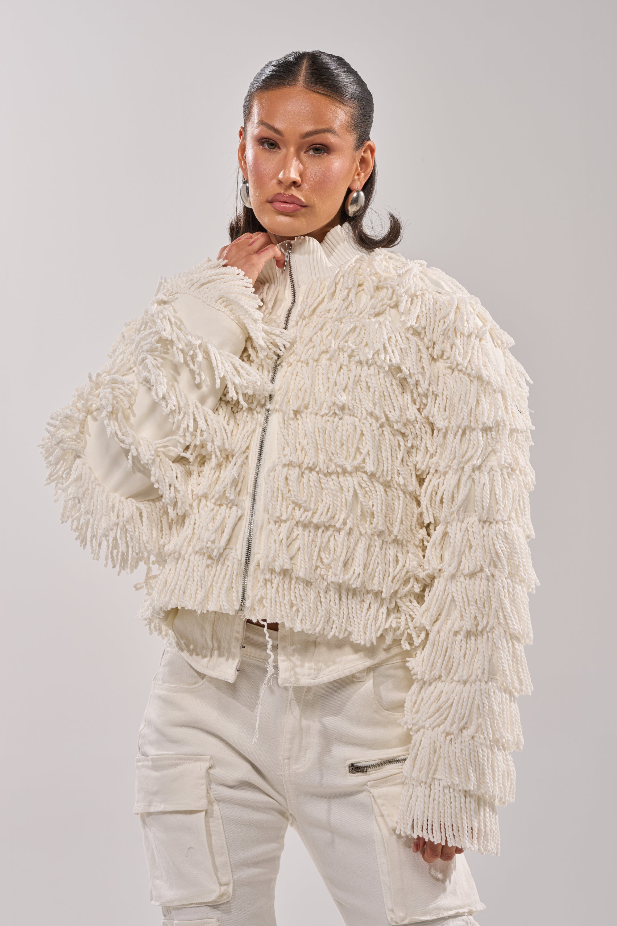 Head-turning fringe bomber jacket with an ultra-textured shaggy finish, perfect for winter layering, festival nights, or a luxe street-style moment. Featuring a cozy zip-front design with a ribbed mock neck collar and voluminous long sleeves, this statement piece boasts tiered, tassel-like fringe detailing a cropped silhouette, inner quilted lining, and shoulder pads. Style it with sleek boots and bold sunnies for an effortlessly iconic fit.