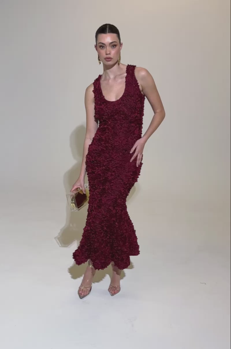 Pinkies up! The AKIRA Label Garden Party Floral Midi Dress will have you feeling fancy and fabulous. Crafted from a stretchy mesh base fabrication, this sumptuous stunner is adorned with layers of textured, tonal flower petals in a rich wine-red hue. It also features a plunging scoop neckline, wide tank straps, and a sultry, curve-skimming fit with a flared skirt, resulting in a mermaid-like silhouette. Complete with sleek interior lining and a metallic zip-back closure.