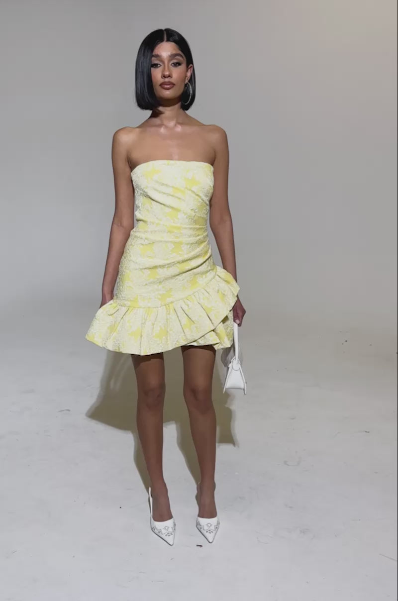 Soft, sweet, and made to turn heads — The AKIRA Label Garden Party Mini Dress is your go-to for any sunny day event. This strapless mini dress features a ruched bodice for a flattering, sculpted fit and a ruffled hem that adds just the right amount of flirt. The soft yellow floral print brings a fresh, romantic vibe, perfect for garden parties, brunches, or wedding guest moments. Finished with a back zipper closure for easy wear, this dress pairs effortlessly with heels, hoops, and a mini bag for a polished look.