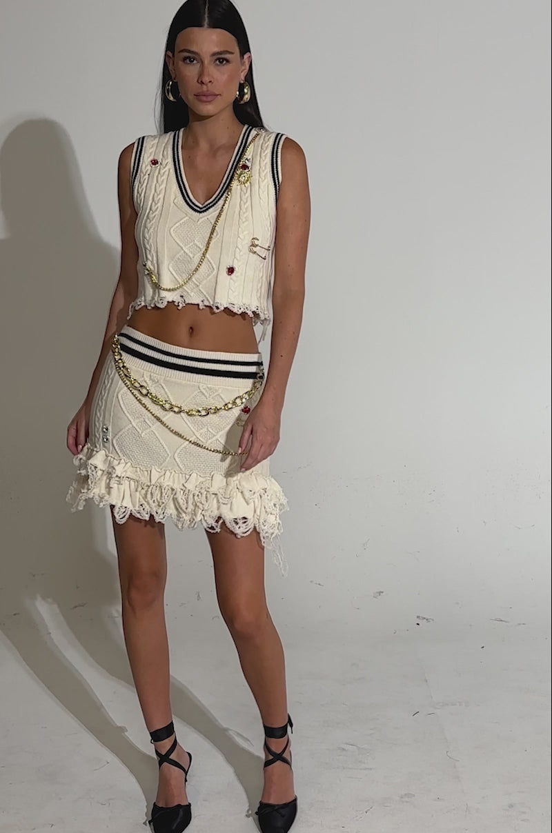 The AKIRA Label Girly Pop Sweater Mini Skirt seamlessly blends classic prep and editorial edge. Crafted from an irresistibly soft cable knit, it features a high-rise, curve-hugging silhouette, a wide, ribbed waistband with contrast stripe accents, and a raw-edged hem with tiered ruffle detailing. Assorted embellishments—including ruby and diamond-inspired jewels, oversized gold safety pins, and two draped gold chains—adorn the front for a touch of sophisticated sparkle. Complete your chic look with the coordinating Girly Pop Sweater Tank, an oversized blazer, and ballet flats.