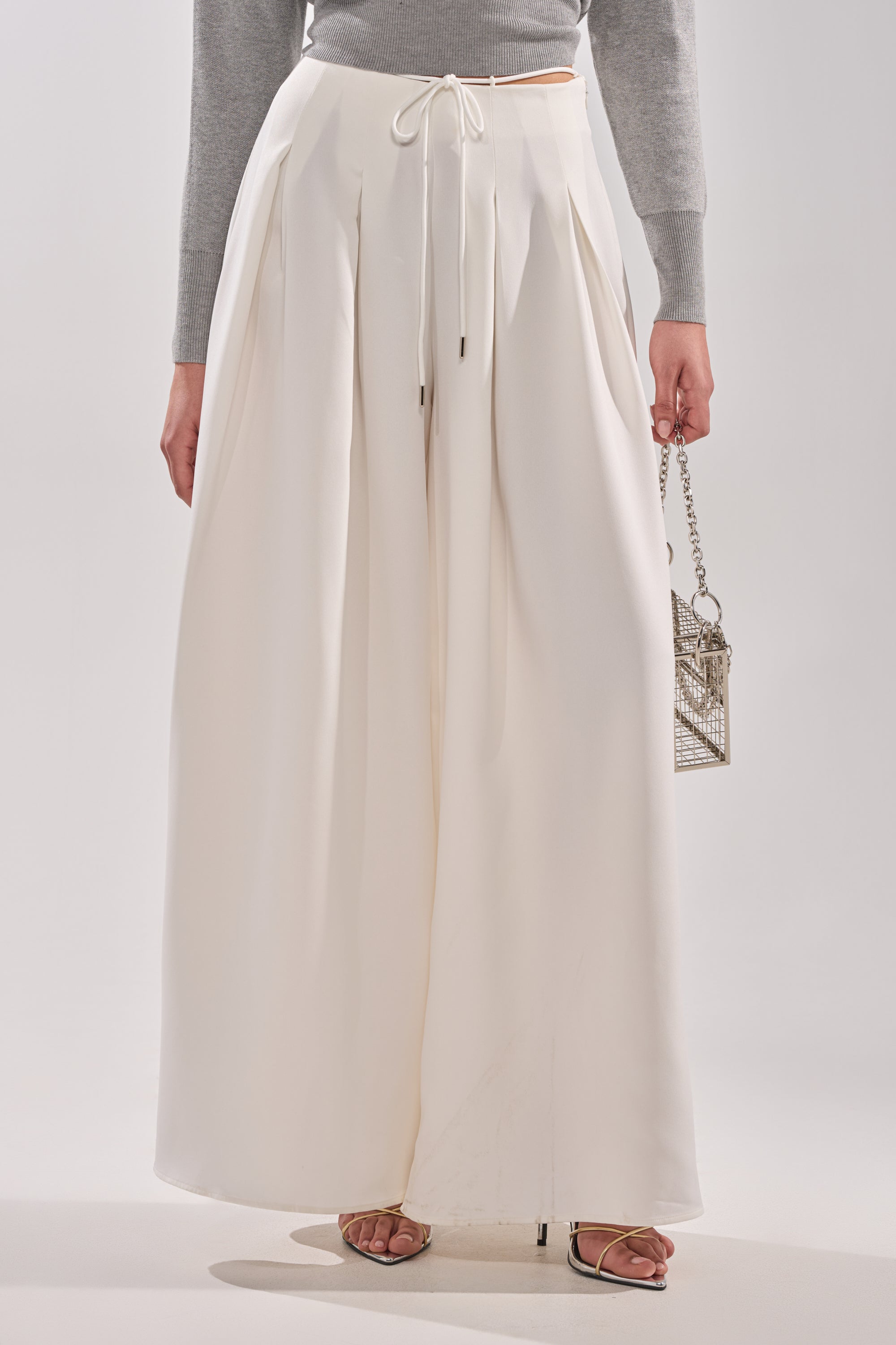White wide-leg trousers designed for modern elegance and all-day comfort. Featuring a high-waisted silhouette with soft front pleating, this style creates graceful movement and a flattering, elongated leg line. The adjustable drawstring waist with an elasticized back and side zipper enclosure adds a relaxed yet tailored touch, blending ease with sophistication. Perfect for pairing with structured tops, soft blouses, or minimalist knits, they are a versatile wardrobe essential with timeless appeal.