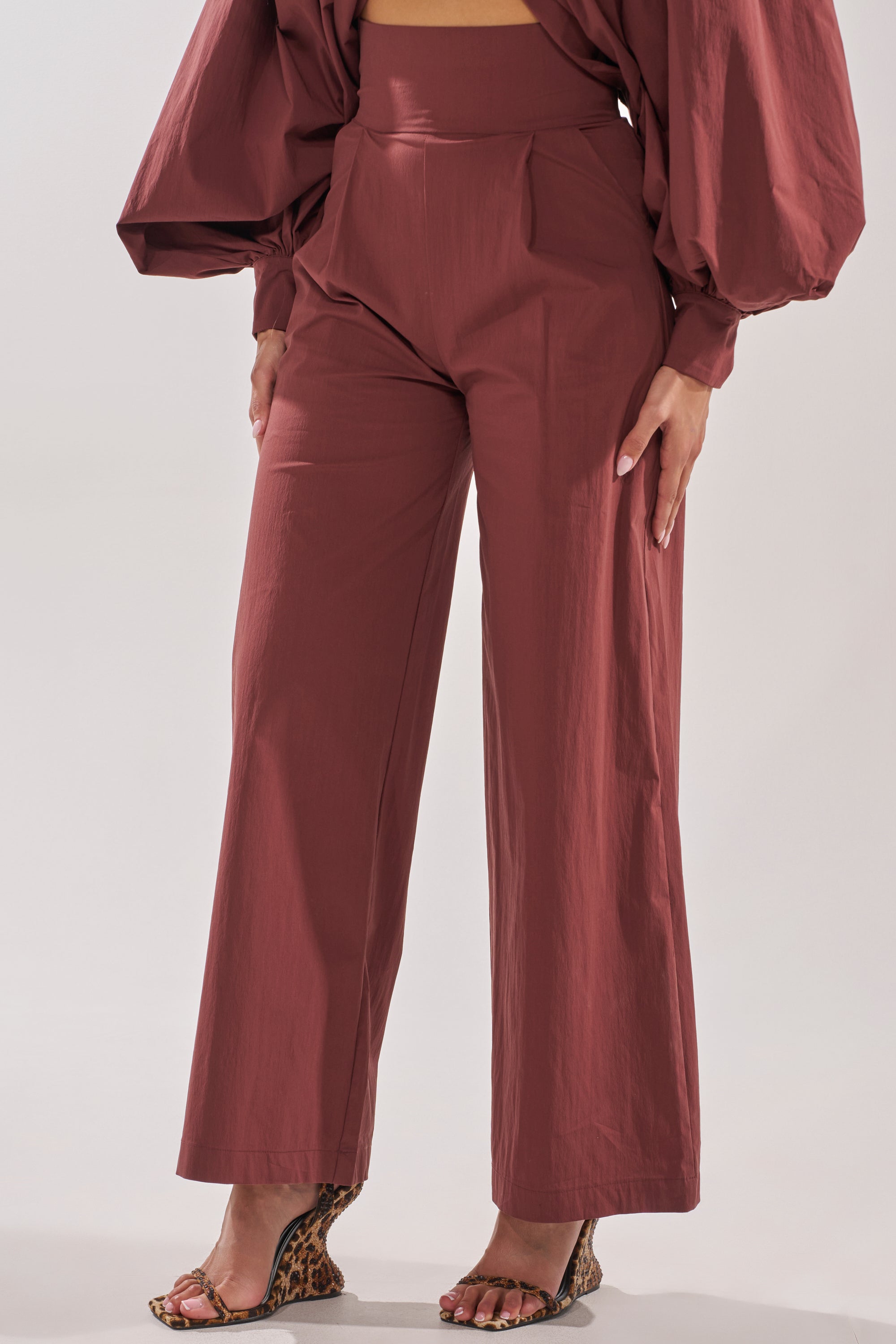 Sleek and sophisticated high-waisted wide-leg pants in rich chocolate brown, perfect for polished street style, dinner plans, or modern matching set moments. These tailored trousers feature a flattering high-rise waistband, dramatic wide-leg silhouette, and smooth back zipper closure for a clean finish. Made from a structured yet comfortable fabric, these pants pair perfectly with the matching AKIRA Label Gold Coast Balloon Sleeve Blouse in Brown for an effortlessly refined outfit.