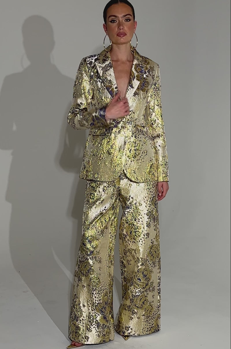 Oh, she’s glowing. The AKIRA Label Goldie Brocade Blazer is brought to you in a non-stretch, structured metallic fabrication and features an ornate floral brocade pattern, a plunging notch lapel collar, a single button front closure, long sleeves, lightly padded shoulders, front flap waist pockets, and a tonal sleek inner lining. Complete with a vented back slit accent, a longline silhouette, and a relaxed fit. Pair with the coordinating AKIRA Label Goldie Brocade Trouser and metallic loafers for a golden girlboss finish.
