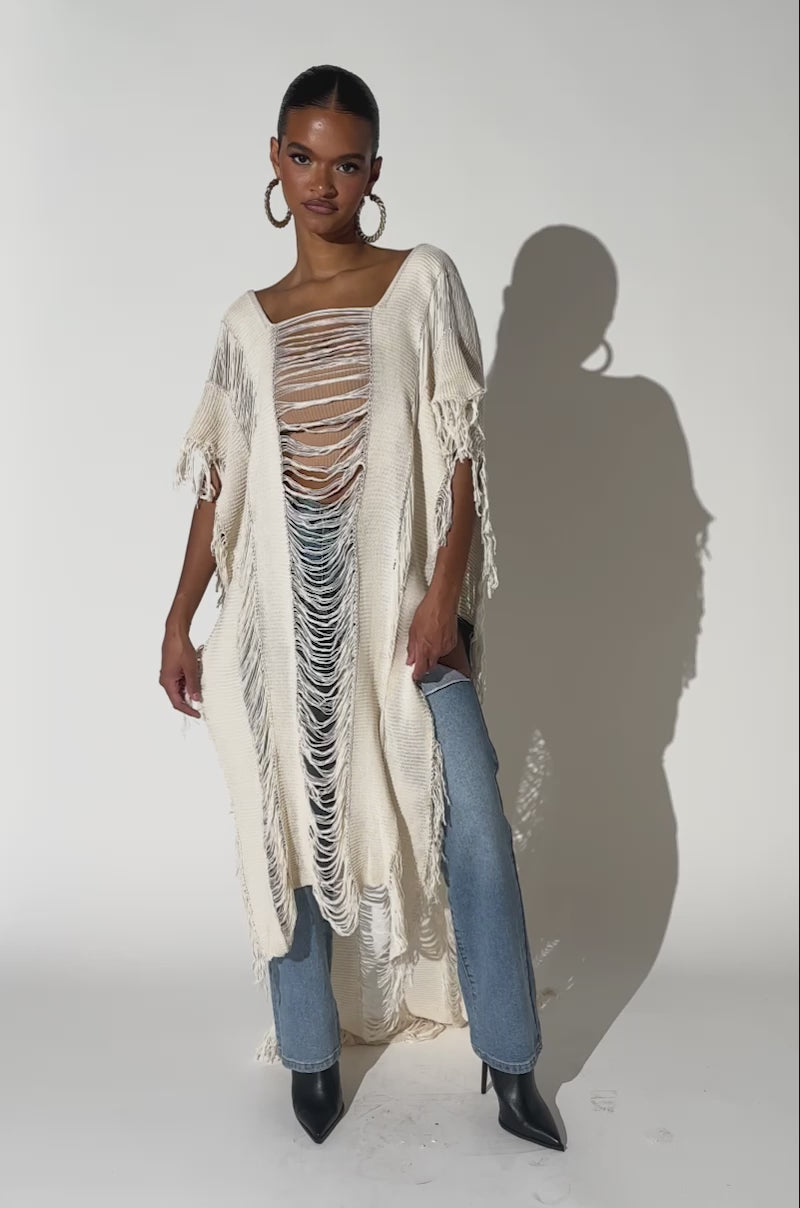 GOOD VIBES DISTRESSED PONCHO IN CREAM