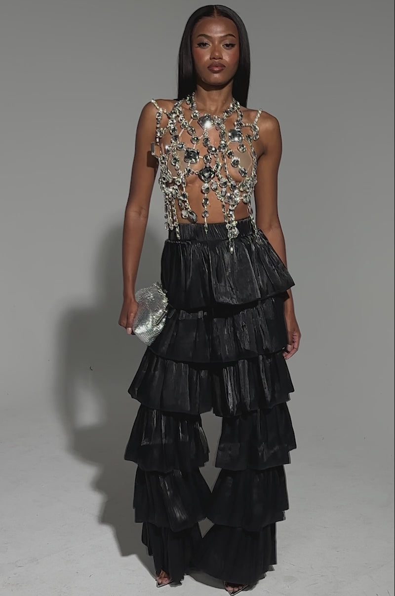 Live the life of a show girl in The AKIRA Label Gotta Let It Go Rhinestone Bralette, a showstopping piece made entirely of oversized crystal-cut rhinestones. Designed with layered clusters of square, teardrop, and round stones, it creates a bold, sculptural look that sparkles from every angle. Cascading rhinestone strands add movement and drama, giving it a chandelier-like effect. Complete with adjustable hook-and-eye closures at the neck and back straps.