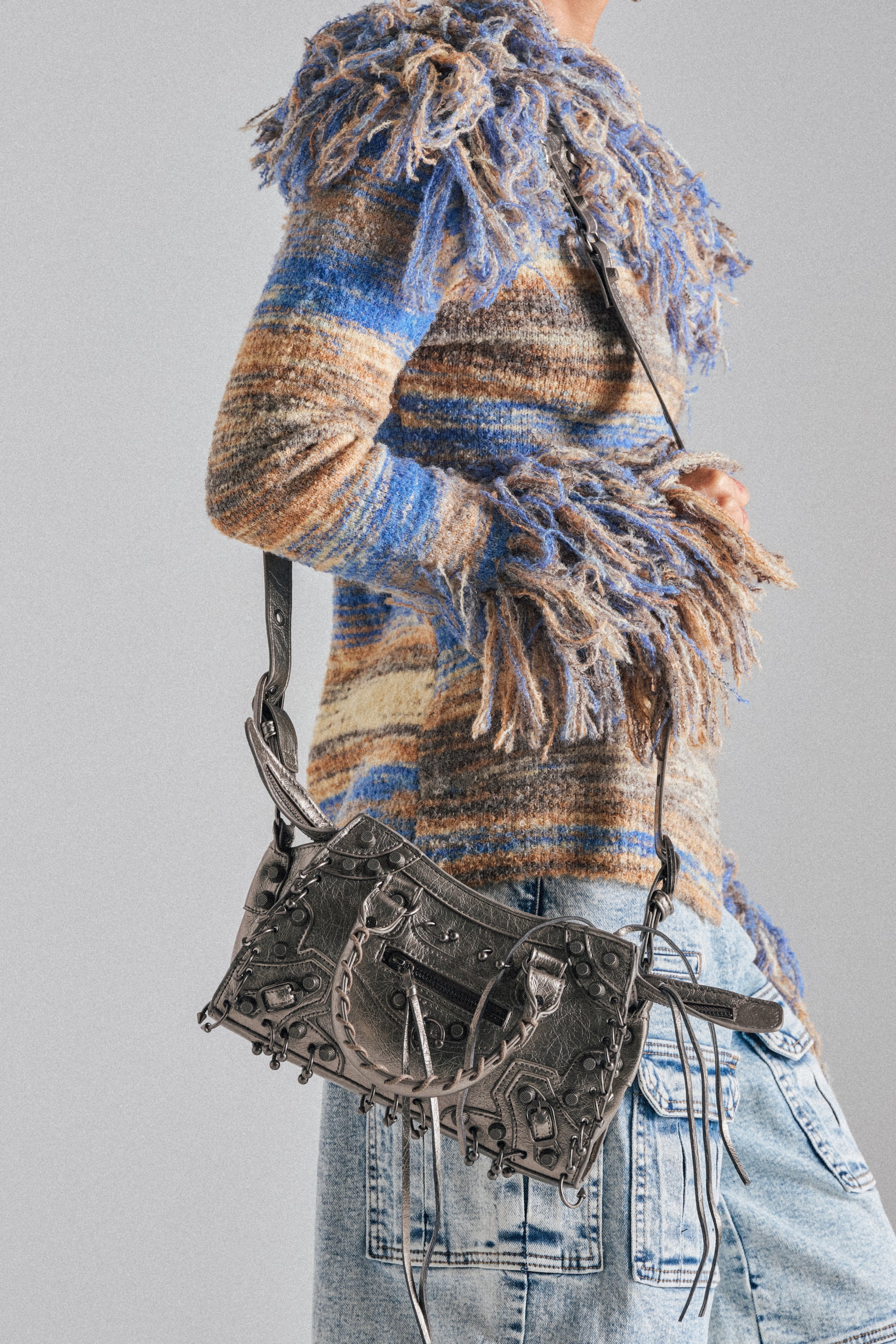 Pretty in punk. The AKIRA Label Grunge Pierced Purse is crafted from textured faux leather in shiny metallic silver. It features a structured silhouette, a wide, flat base, top handles, pierced hardware, chain details, and bold industrial trim that give it a rebellious edge. Complete with a zip-top closure, a spacious interior with additional slip and zippered pockets, and a detachable shoulder strap for versatility of wear. Perfect for adding a grunge-luxe punch to any look.
