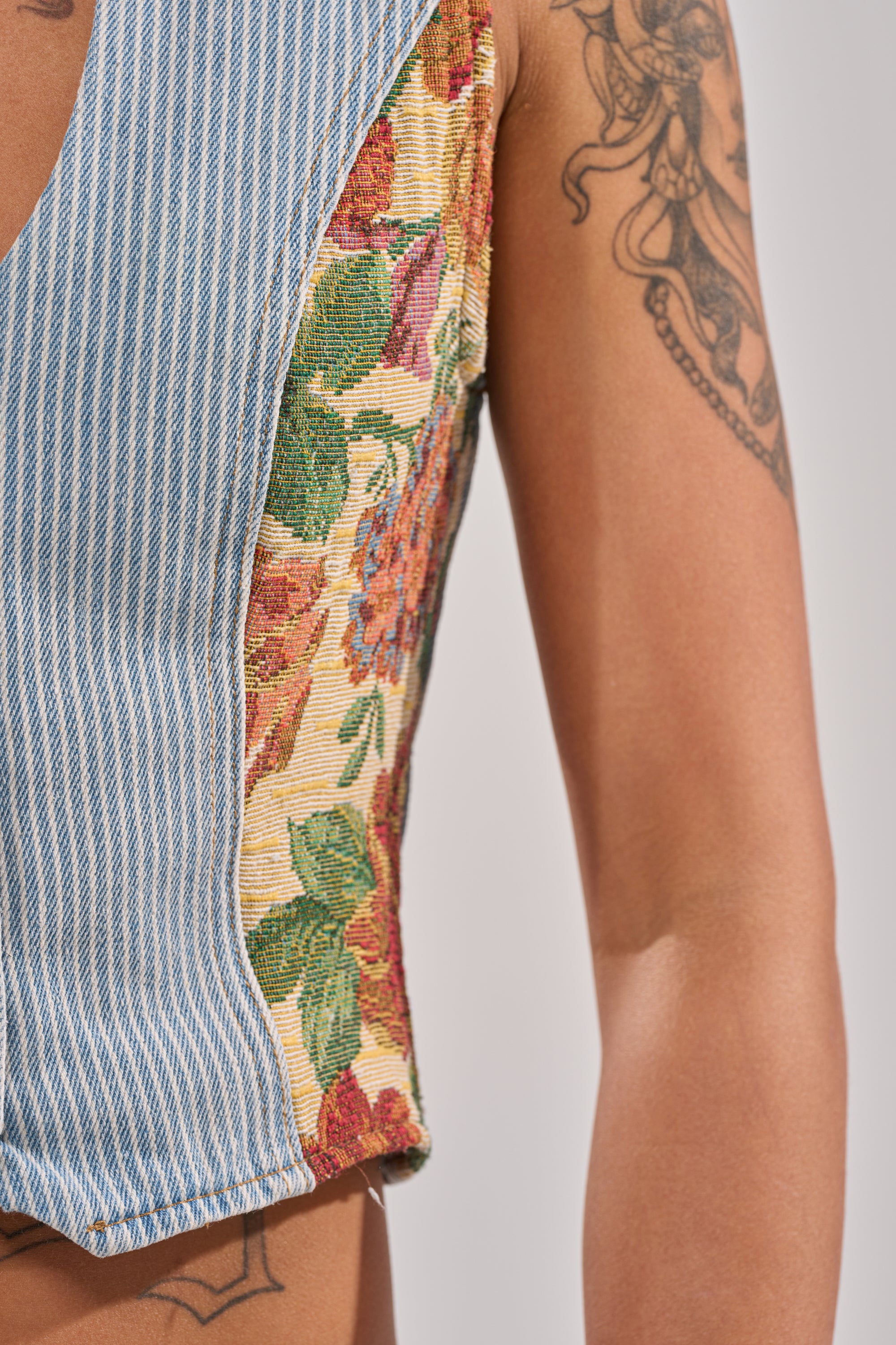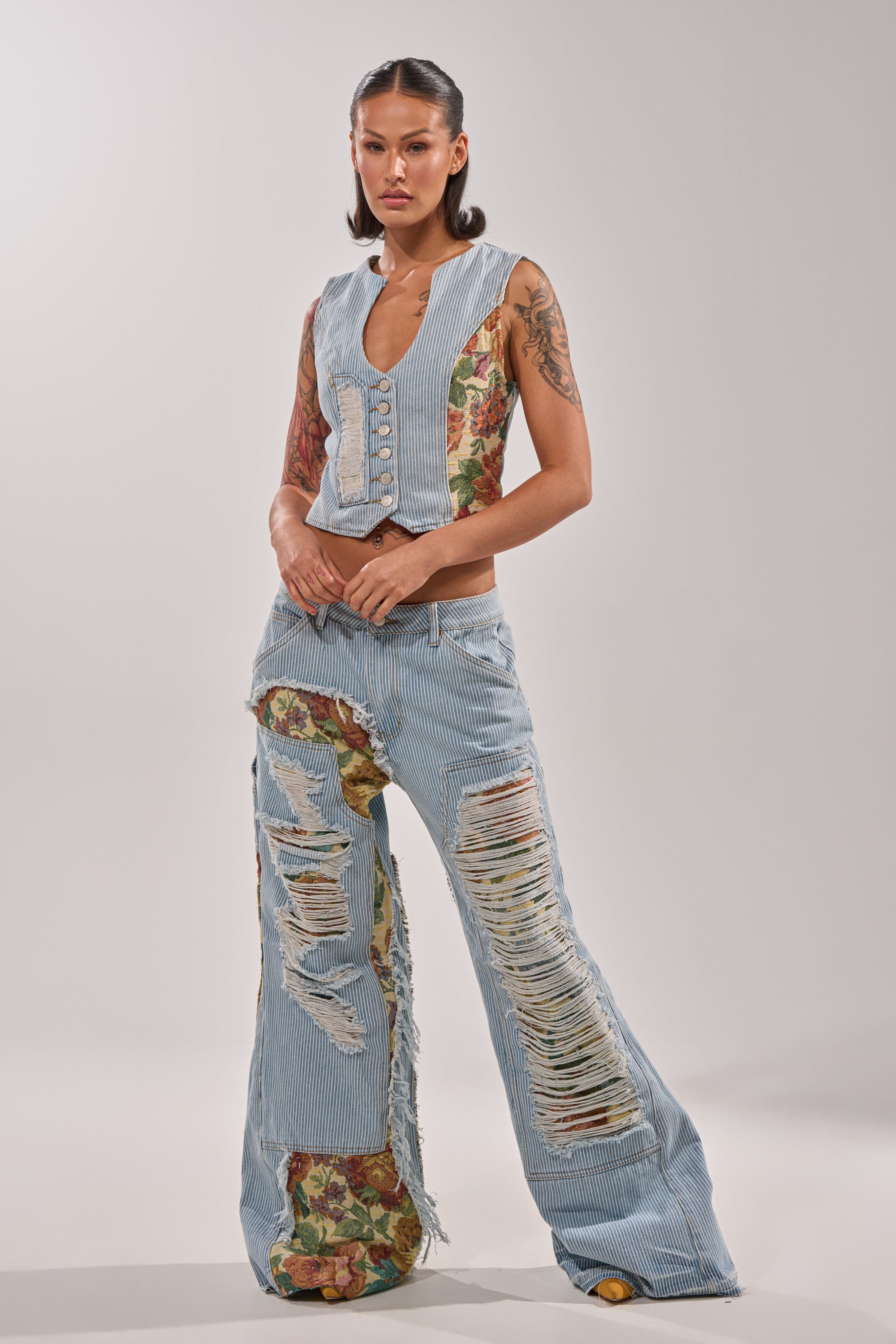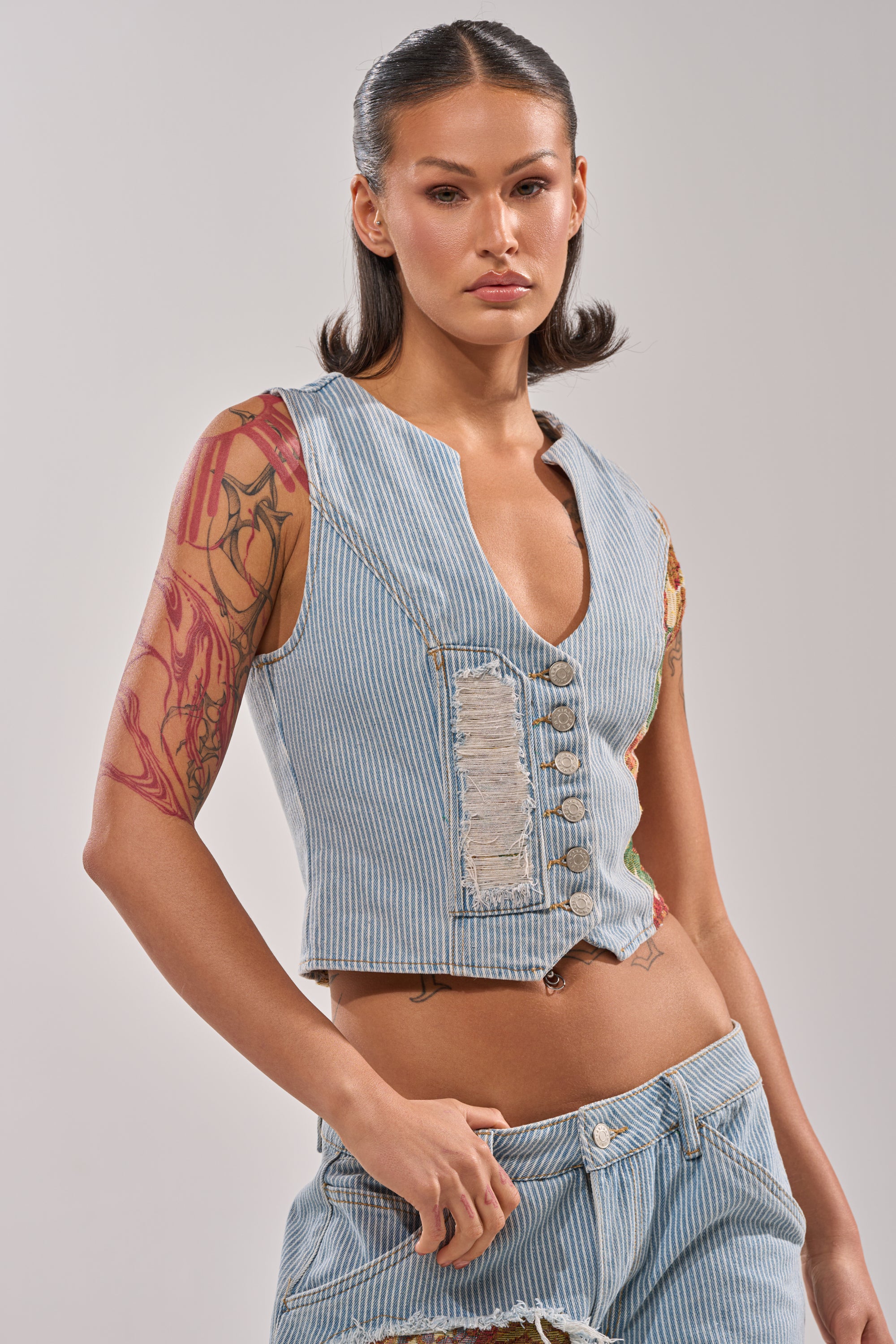 This pinstriped brocade denim vest is the ultimate cool-girl layer, featuring a tailored, curve-hugging silhouette, a deep V-neckline, distressed detailing with vintage floral brocade paneling throughout, and a sleek button-front closure for a sharp, elevated finish. Complete with an adjustable back strap for a sculpted fit. Style it with the matching AKIRA Label Guess Who Stripe Denim With Brocade and heeled mules for an effortlessly polished day-out look.