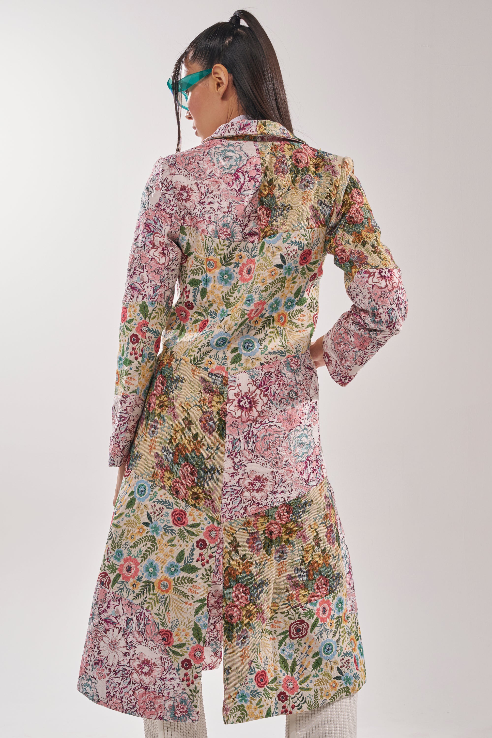 Jacquard patchwork trench coat with a romantic, vintage-inspired vibe, perfect for making a statement while keeping your look polished and refined. Featuring an allover tapestry-style floral jacquard in a mixed patchwork design, a tailored longline silhouette with lightly padded shoulders, a classic notch lapel collar, oversized front patch pockets, and a sleek button-front closure. Complete with a satin inner lining. Style it with a mock neck sweater, straight-leg denim, and heeled boots for a posh finish.