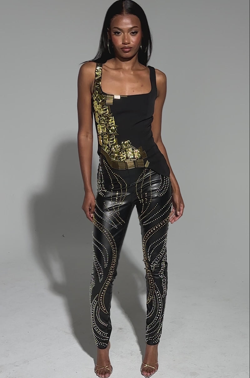 The AKIRA Label Hand-Beaded Luxe Blouse is a structured black top designed with a striking asymmetrical finish. One shoulder and side are fully embellished with sculptural gold hardware and bar accents, creating a bold, textured contrast against the sleek base. The square neckline and tailored fit emphasize clean lines, while the angular, asymmetrical hem adds edge. Complete with sleek inner lining and a back zipper closure.