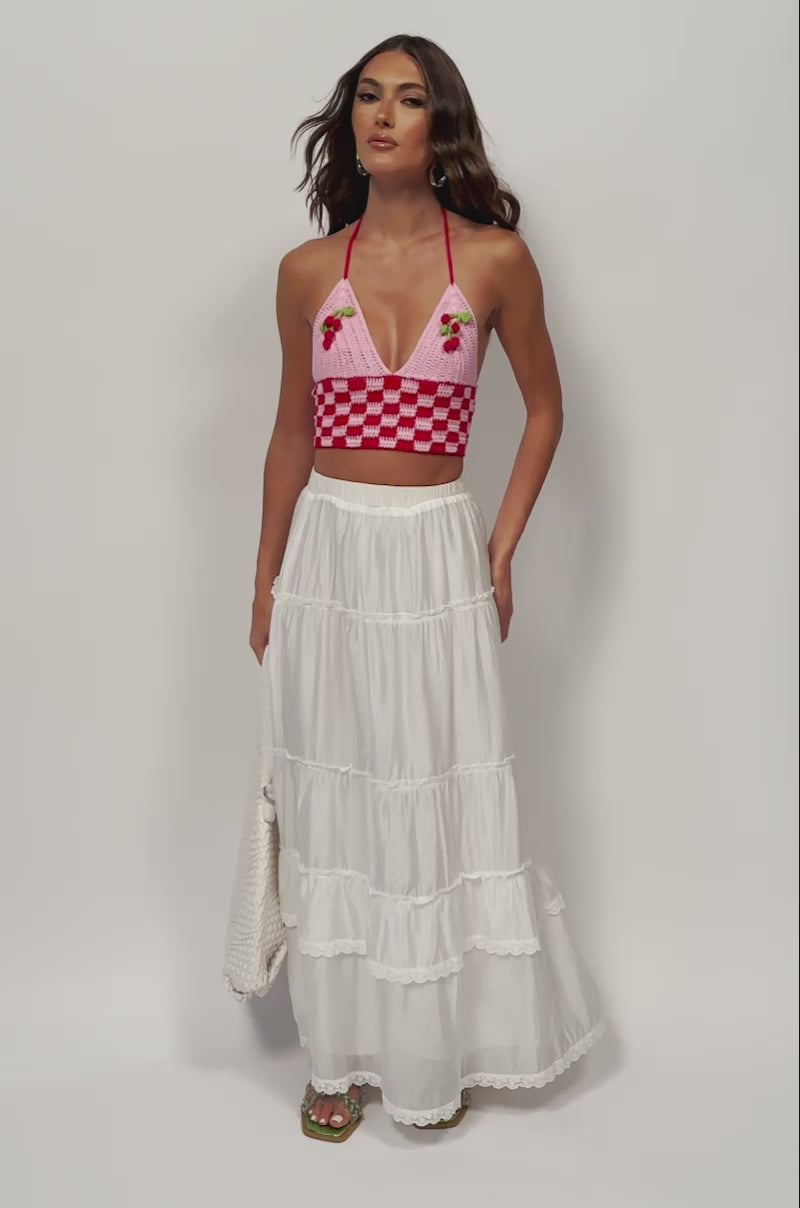 Add a bohemian twist to your looks with The AKIRA Label Haven Flowy Maxi Skirt. This slightly sheer, lightweight skirt features a high rise design, a cinched elastic waistband, tiered layers with ruffled and floral lace trim, an attached inner slip, a pull-on fit, and a flowy, maxi length silhouette. Pair with a cropped baby tee, a pearl waist chain, and Western ankle booties for a finished look.