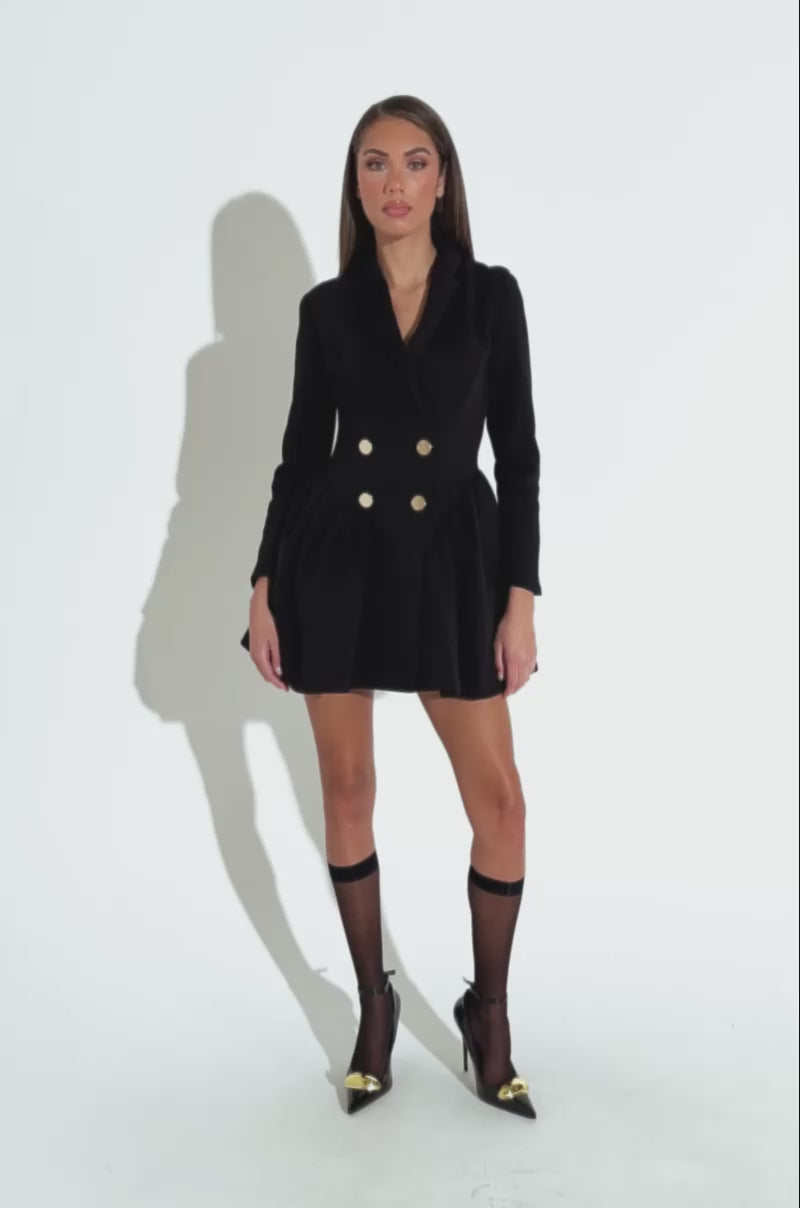 The AKIRA Label HBIC Blazer Mini Dress In Black is made from a slick, structured fabrication and features a notch collar, long sleeves, princess seam detailing, a mini silhouette, polyester lining, and a peplum hem. Complete with a double breasted front closure and inner zipper for structure. Pair with pumps and a clutch to finish off your chic look.