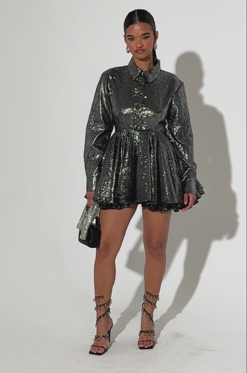 The spotlight is yours in The AKIRA Label The It Girl Metallic Mini Dress. This chic piece is crafted from a textured, shimmering silver tencel fabrication and features a pointed fold-over collar, a tonal button down front closure, long button cuff sleeves, smooth inner lining, and a flouncy, full-bodied, pleated skirt reinforced with layers of tulle for structure. Style it with patterned tights and platform mary janes and embrace your It-Girl status.