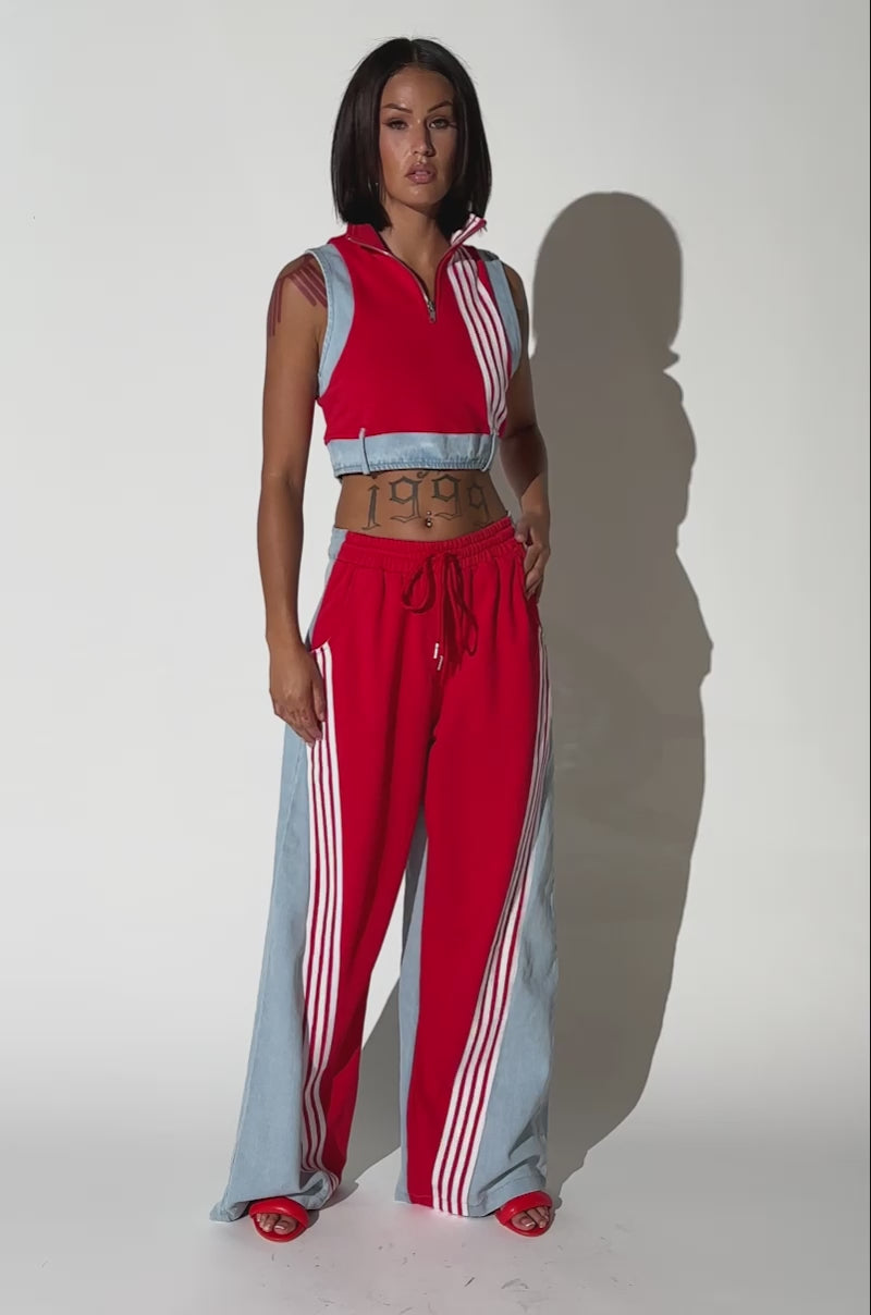 Score every time in The AKIRA Label Heads Up Tank. This sporty style is crafted from a mix of a cotton fleece-inspired material and a non-stretch light wash denim base and features mock collar, a sleeveless design, a contrast striped fleece-inspired panel running down the front and back of the bodice, denim trim throughout with functional belt loops at the waistband, and a faux silver metallic half zipper on the front and a full length zipper on the back. Complete with a cropped silhouette and an easy, pull-on fit. Pair with the coordinating AKIRA Label Heads Up Flare Pant for a finished look.