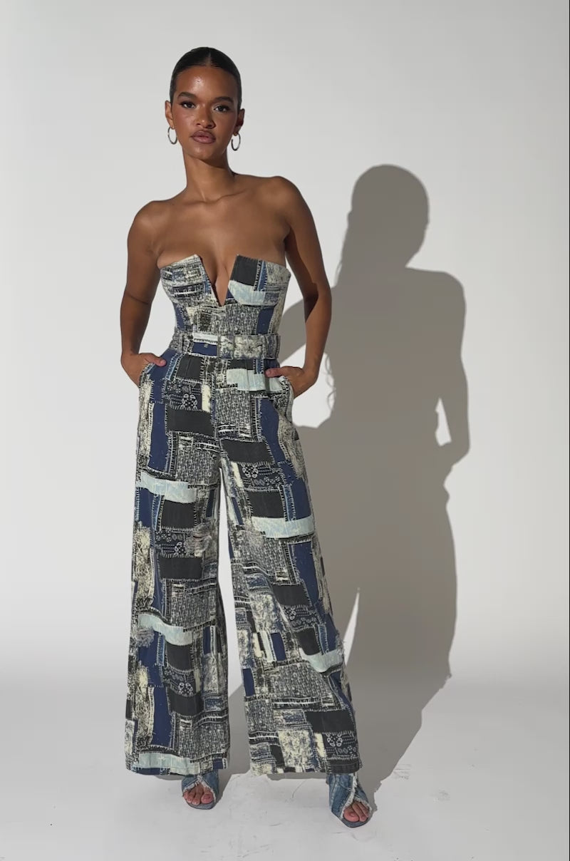 Rock n’ roll with The AKIRA Label Hendrix Printed Denim Jumpsuit. This funky piece is crafted from non-stretch cotton blend denim fabrication and features a printed patchwork design of various toned denim, a strapless neckline with inner elastic trim, a structured front slit with inner boning, side slant front pockets, and functional belt loops with a coordinating attached belt with faux silver metallic hardware and grommet detailing. Complete with tonal stitching, a back zipper closure, and a wide leg silhouette. Pair with platform pumps and a handbag for the perfect denim ensemble.