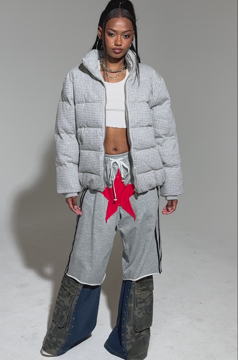 Make some magic happen in The AKIRA Label Houdini Mid Rhinestone Puffer. This glittering outerwear piece is crafted from a cotton base and features tonal glittering rhinestone embellishments throughout, a paneled construction, a standing collar, long sleeves with ribbed knit cuffs and thumbhole accents, side slant front pockets, and an elasticized waistband. Complete with an inner lining, a pillowy, padded interior, and a slightly oversized silhouette to slay on even the chilliest of days.