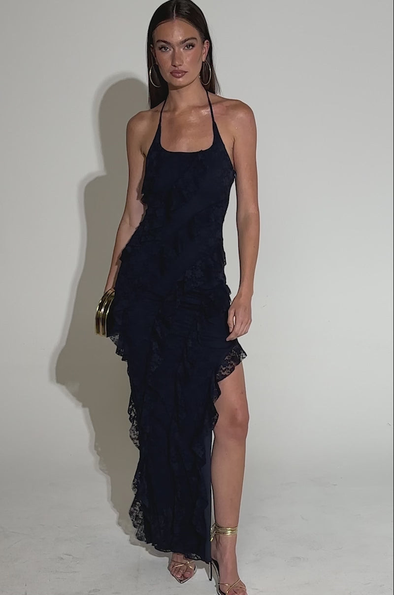 Classy and sassy. The AKIRA Label I Got It All Lace Midi Dress is crafted from delicate floral lace in an elegant navy hue. It features a curve-skimming silhouette, a halter neck with thin, self-tie straps, a thigh-high side slit, and tiered ruffle detailing that cascades diagonally from shoulder to hem for romantic, feminine flair. Complete with silky-smooth interior lining and a tonal side-zip closure.