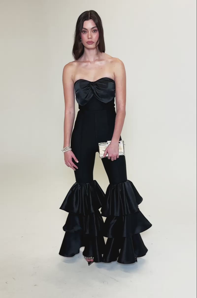 Less yapping, more dancing! The AKIRA Label I Just Wanna Dance Flare Leg Jumpsuit is crafted from a super stretchy base fabrication that’ll allow you to move and groove all night long. It features a strapless silhouette, a sweetheart neckline with a tonal bow-inspired overlay, contour seaming, and pantlegs that flare dramatically from the knee to the hem with tiered ruffle detailing. It’s complete with a tonal back zipper closure. Style it with a pair of sparkling opera gloves and platform heels and dominate the dance floor, disco diva!
