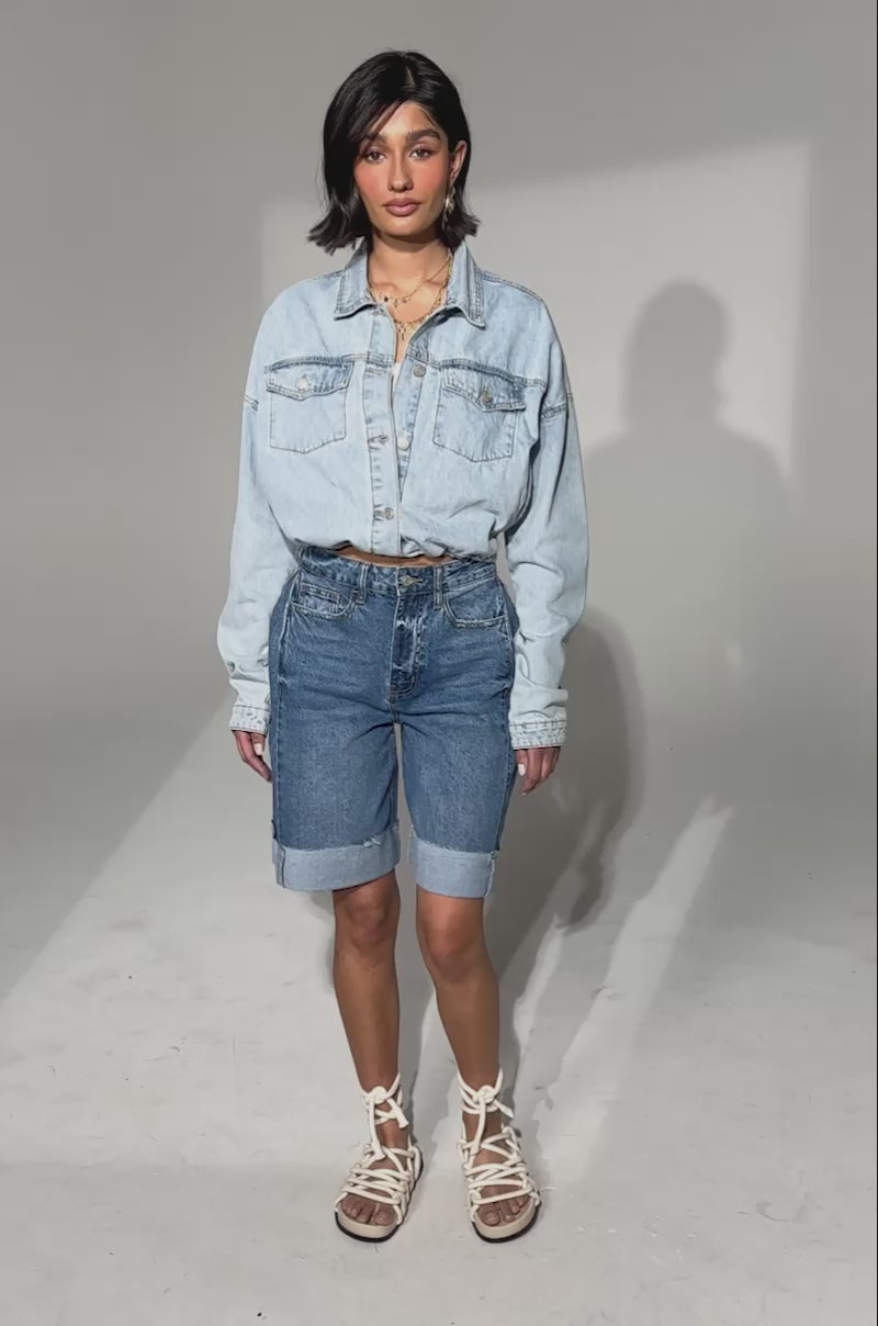 Level up your streetwear with The AKIRA Label Iggy Adjustable Denim Jacket, a reimagined classic with an edge. This cropped jacket features a relaxed, boxy fit in a faded light wash for a worn-in, vintage look. It features a pointed collar, drop shoulders, long sleeves with button cuffs, oversized flap chest pockets, waist pockets, and a button-down front closure. Complete with bungee cord closures at the hemline for an adjustable, cinched silhouette. From casual coffee runs to night-out layering, this jacket will be your go-to for versatile styling.