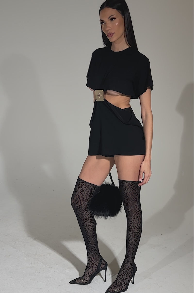 Rules? You make them in The AKIRA Label I’m The Boss Cut Out T-Shirt. Crafted from stretchy, soft cotton, this edgy top features a classic crew neckline, short sleeves, a high-shine gold rectangular centerpiece at the center of the bodice and lower back, sultry cut out detailing on each side of the waist, and a back zipper closure. Complete with a relaxed, pull-on fit. Style with a maxi leather skirt, stiletto heels, and a vampy lip for a finished look.